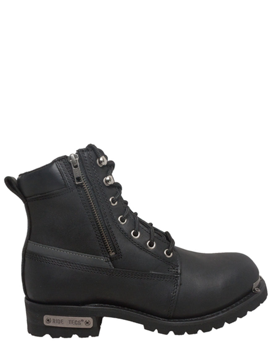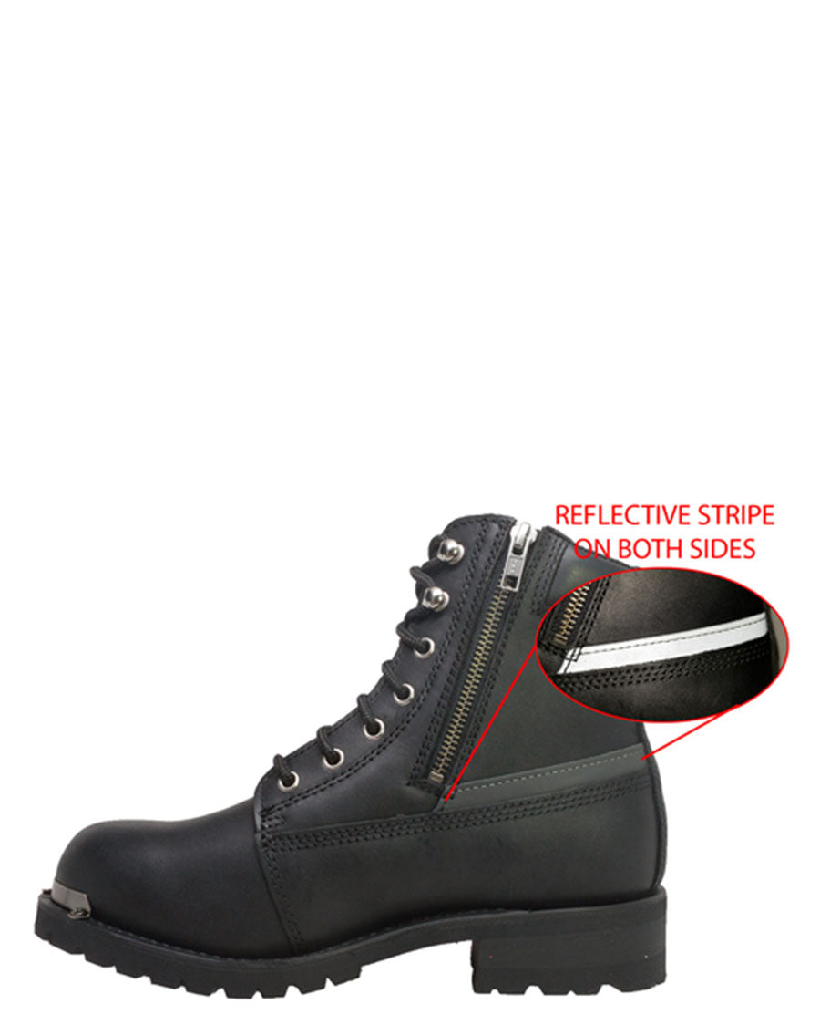 You'll feel good wearing this ultimate stylish motorcycle boot from Ride Tecs featuring reflective trim on both sides and double side zipper. All the features that make the best riding boot including Full-Grain Leather, oil resistant outsole and PU cushioned insole to make it so comfortable to wear all day long.