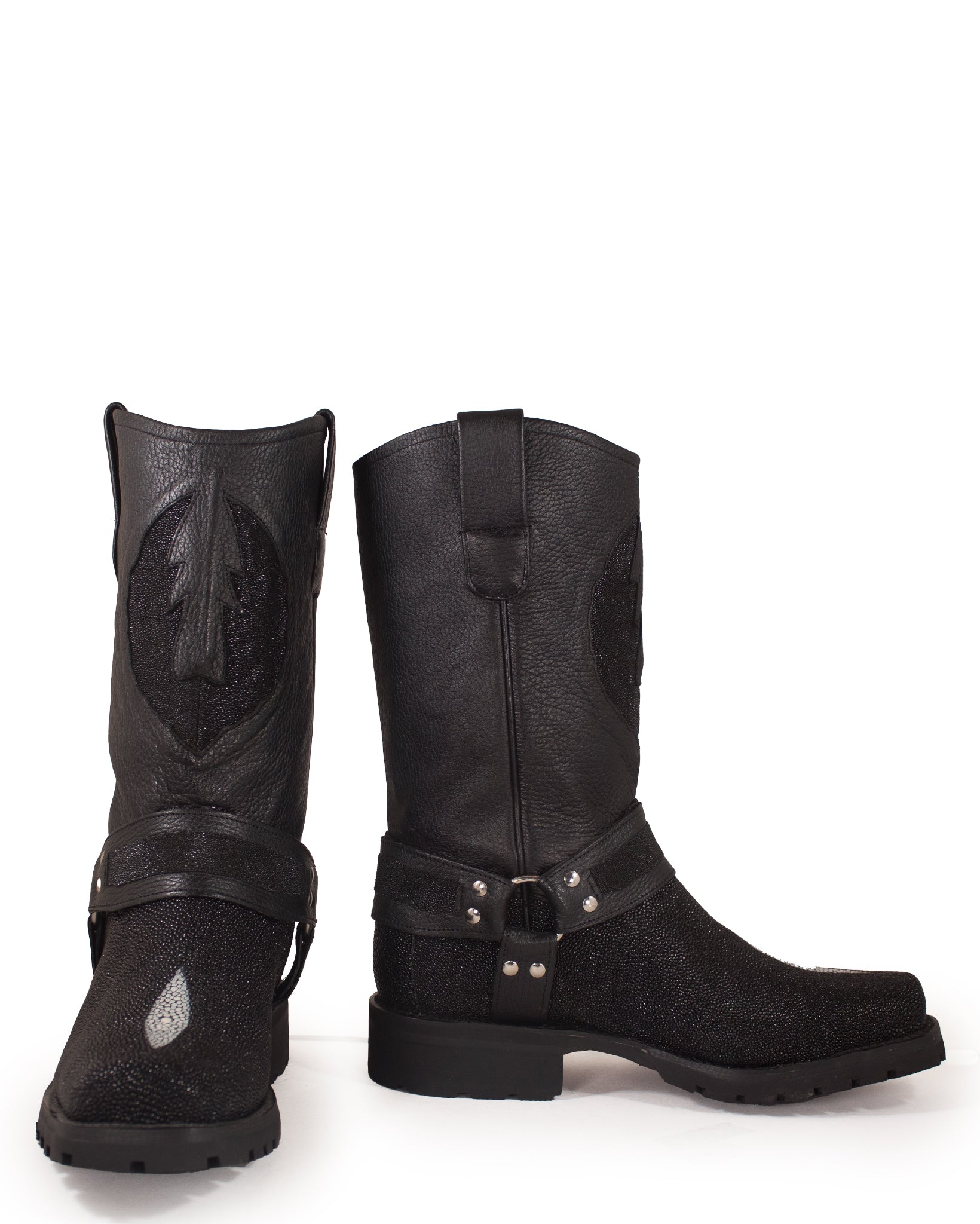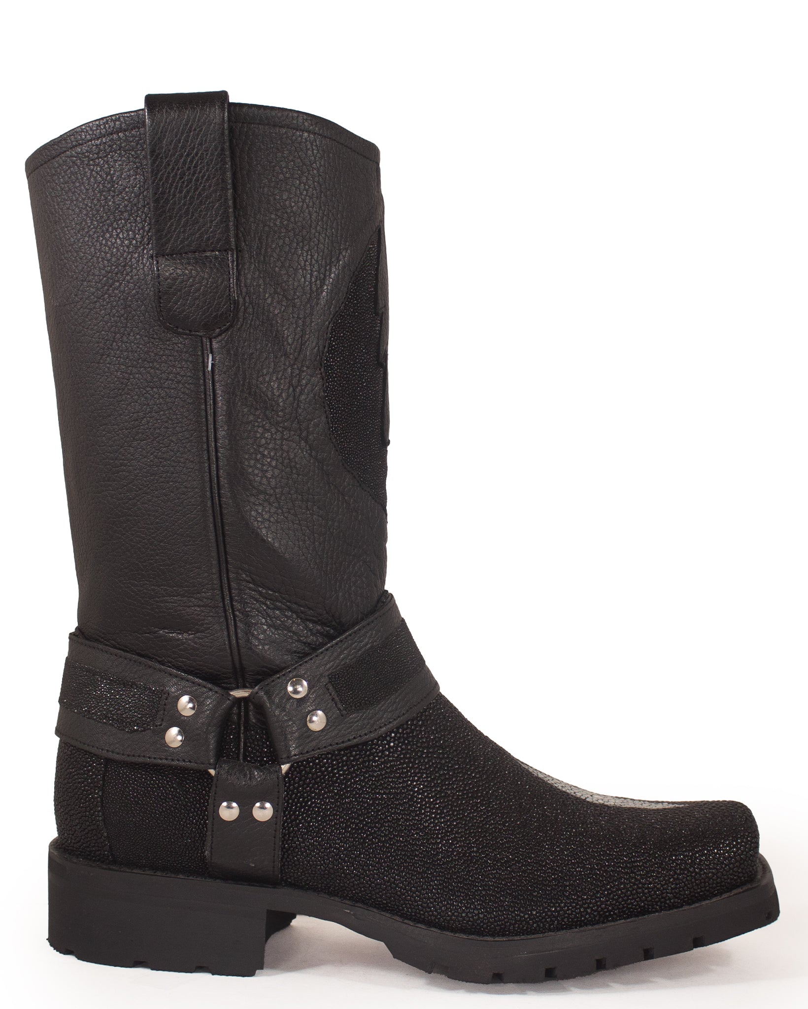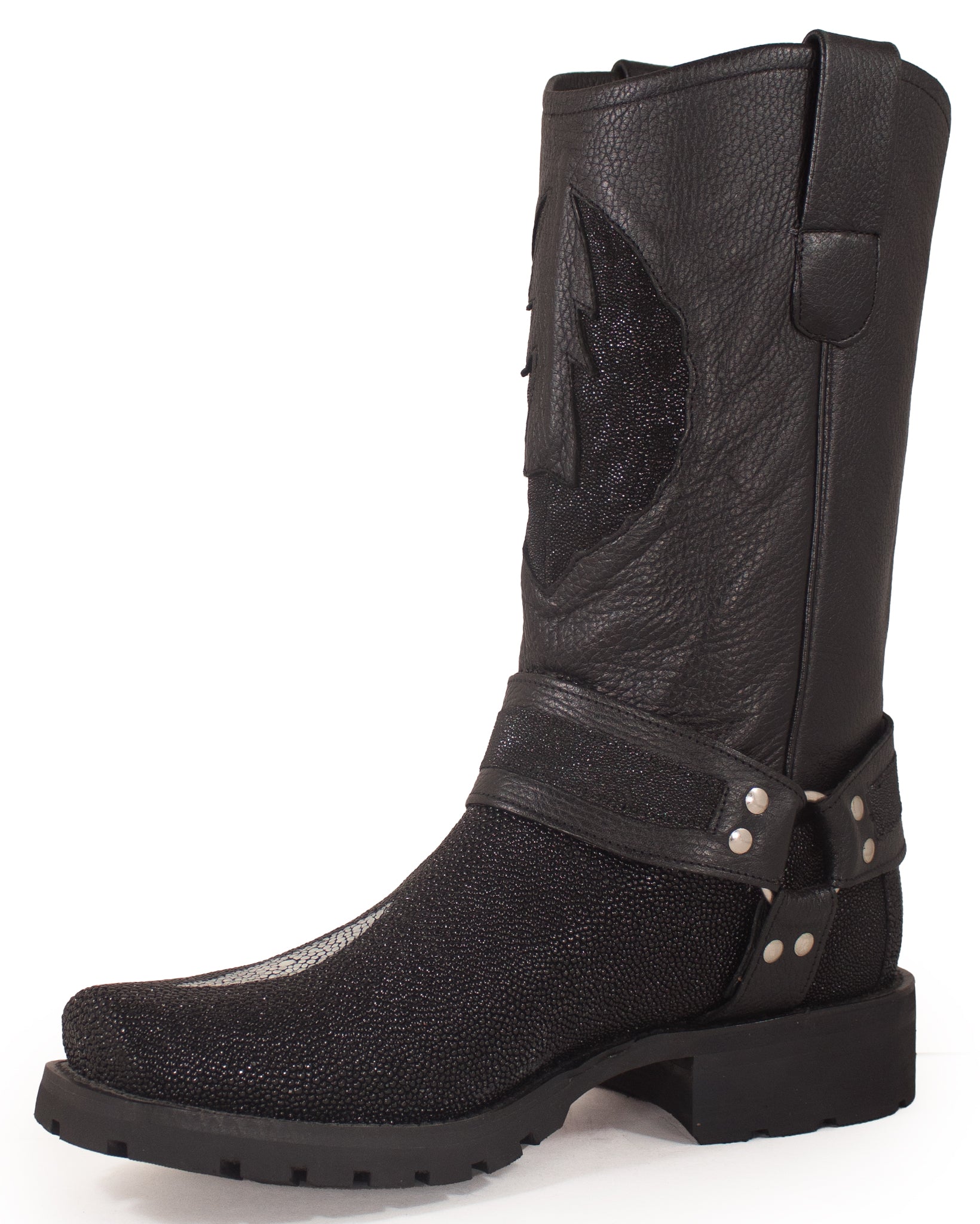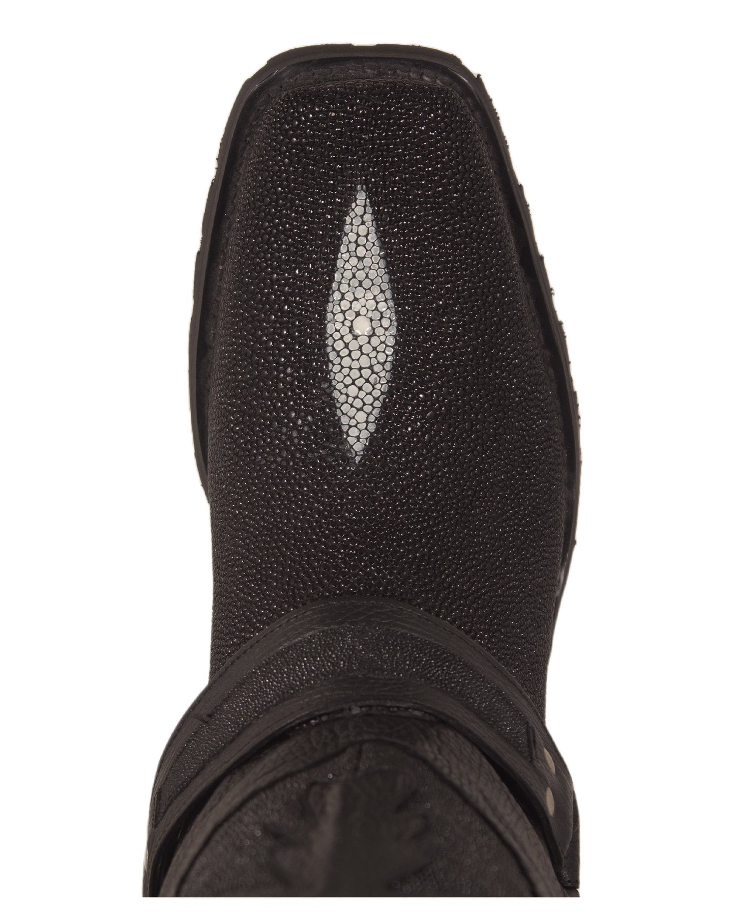 Introducing the Los Altos Men's Single Stone Stingray Motorcycle Boots, the perfect fusion of rugged style and luxurious craftsmanship! Crafted using single stone stingray, designed for the adventurous biker with an eye for fashion, these boots are guaranteed to make a statement wherever you go. Built for comfort as well as style, these boots feature a square toe and a single-stitched design, ensuring a relaxed fit for long rides or a night on the town. But it's not just about the looks—the heavy black leather harness strap, paired with the industrial outsole, ensures your boots are built for the toughest of rides. Proudly made in Mexico, the Los Altos Men's Single Stone Stingray Motorcycle Boots are a testament to expert craftsmanship and superior quality. So, give your feet the luxury they deserve, and ride out in style with these exclusive boots.