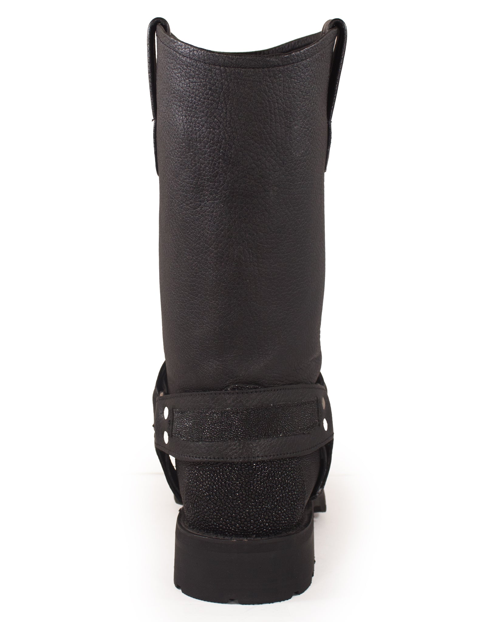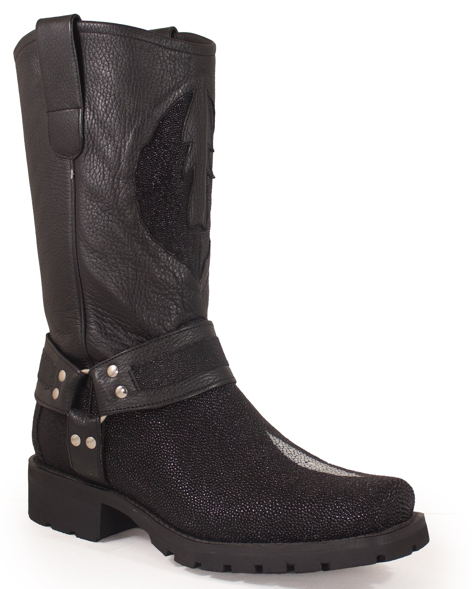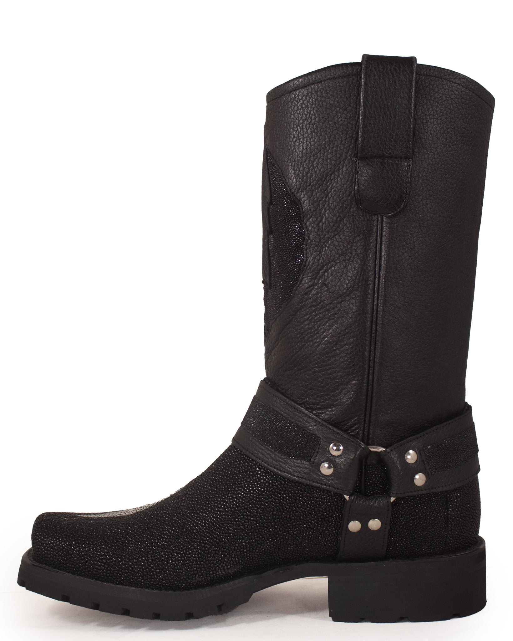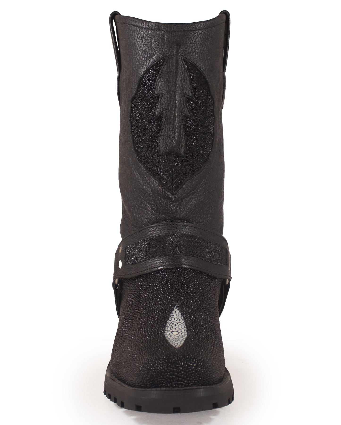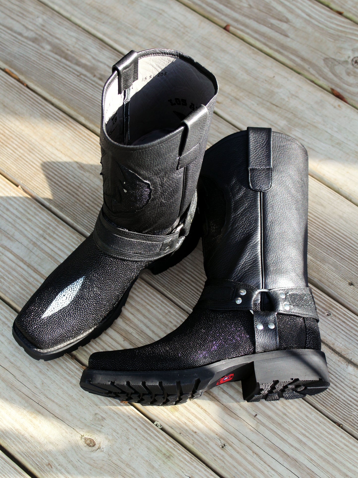 Introducing the Los Altos Men's Single Stone Stingray Motorcycle Boots, the perfect fusion of rugged style and luxurious craftsmanship! Crafted using single stone stingray, designed for the adventurous biker with an eye for fashion, these boots are guaranteed to make a statement wherever you go. Built for comfort as well as style, these boots feature a square toe and a single-stitched design, ensuring a relaxed fit for long rides or a night on the town. But it's not just about the looks—the heavy black leather harness strap, paired with the industrial outsole, ensures your boots are built for the toughest of rides. Proudly made in Mexico, the Los Altos Men's Single Stone Stingray Motorcycle Boots are a testament to expert craftsmanship and superior quality. So, give your feet the luxury they deserve, and ride out in style with these exclusive boots.