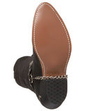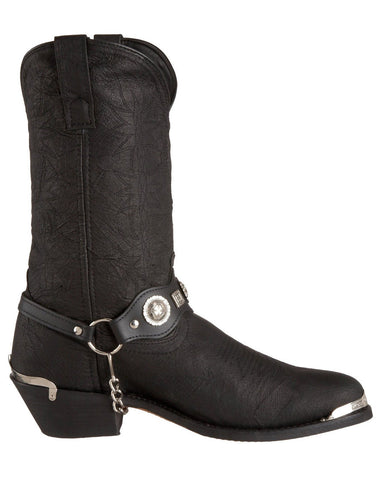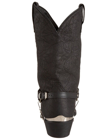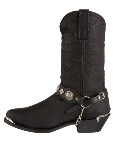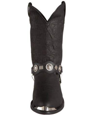 These affordable pigskin boots are a great choice for any man that wants to add a bit of Western flair to their wardrobe. The black embossed leather gives them depth and style. They feature black straps with metal accents and chrome toe details. The pull tabs and dip openings make for easy dressing. These are the perfect boots for the part-time cowboy. Wear them with a pair of jeans for a contemporary Western look.