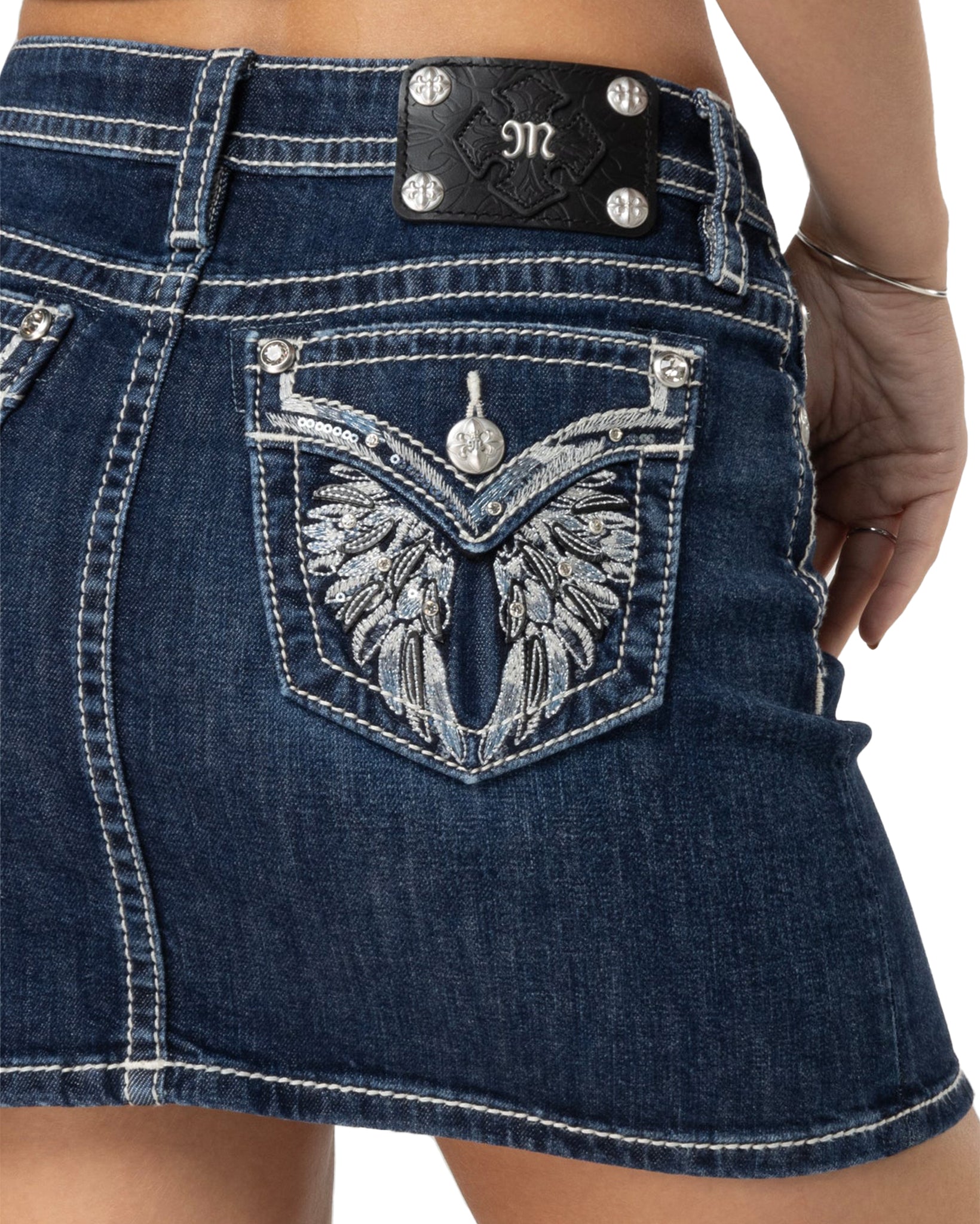 - Embroidered downturn wing design with rhinestone rivets and sequin detailing