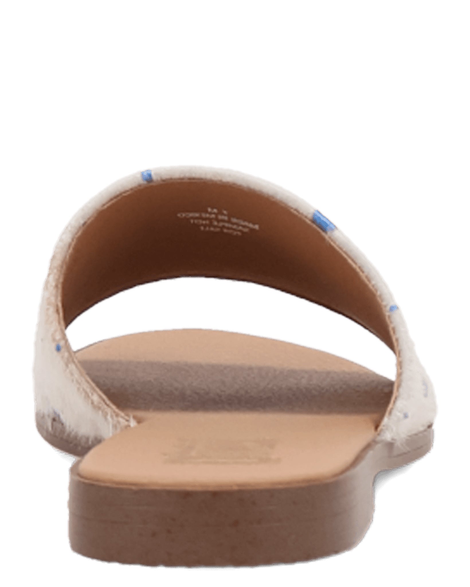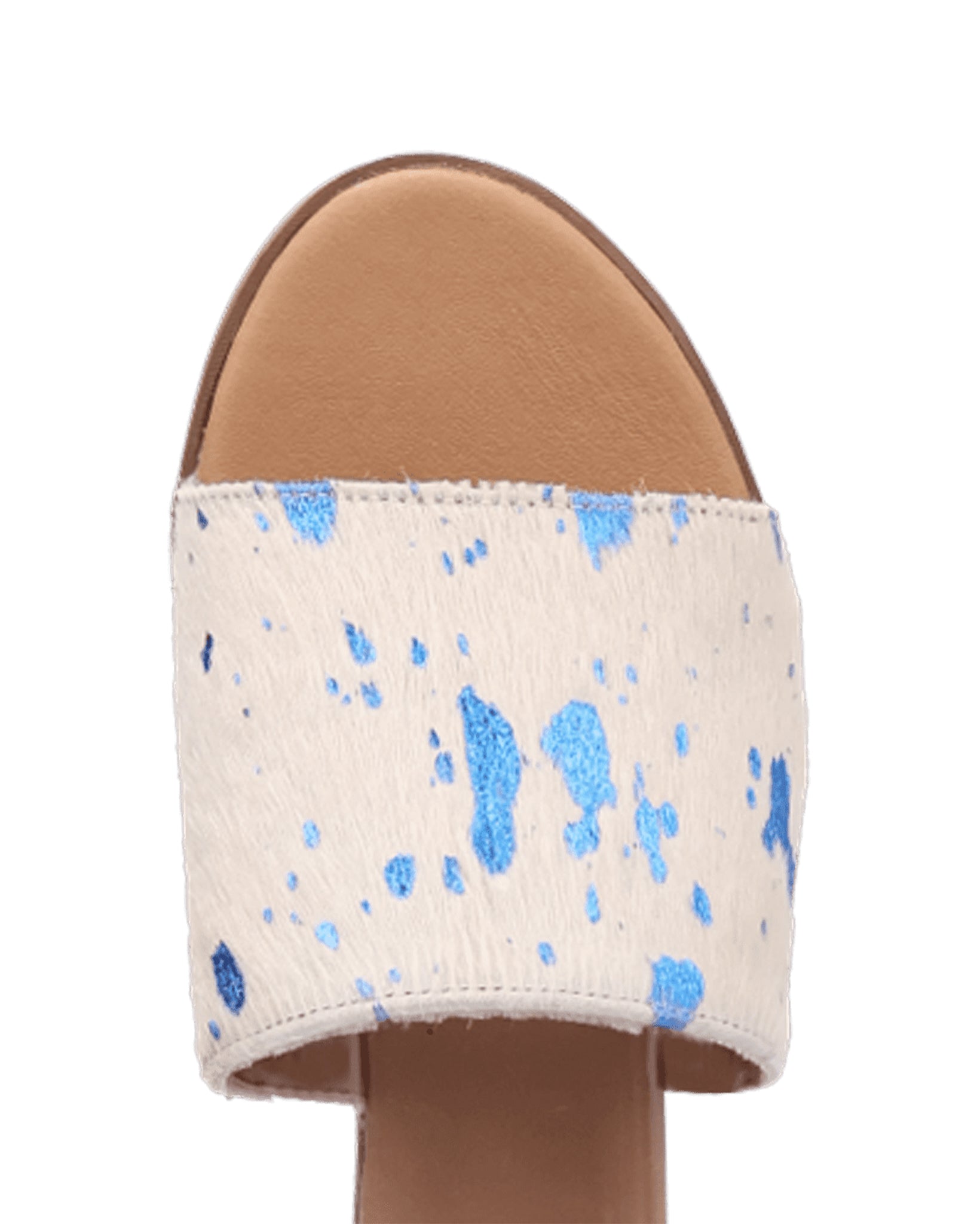 Experience the unique with Moo Moo. These sandals, crafted with luxurious hair-on-hide and accented with shimmering metallic details, are a statement piece that will turn heads wherever you go.
