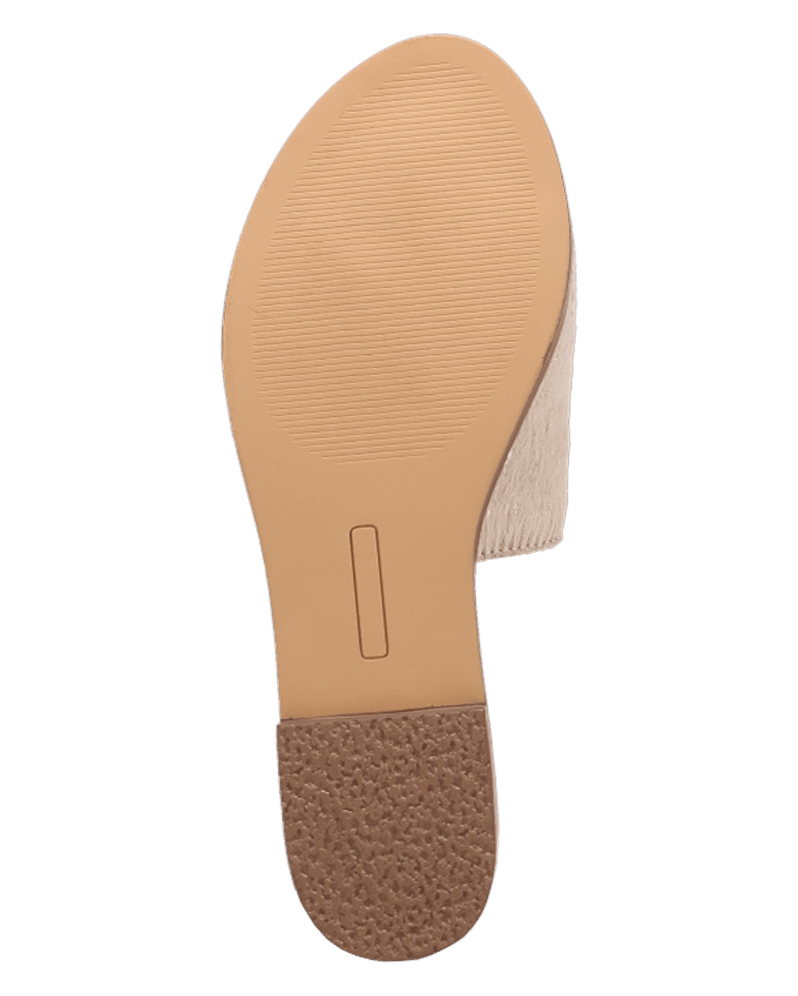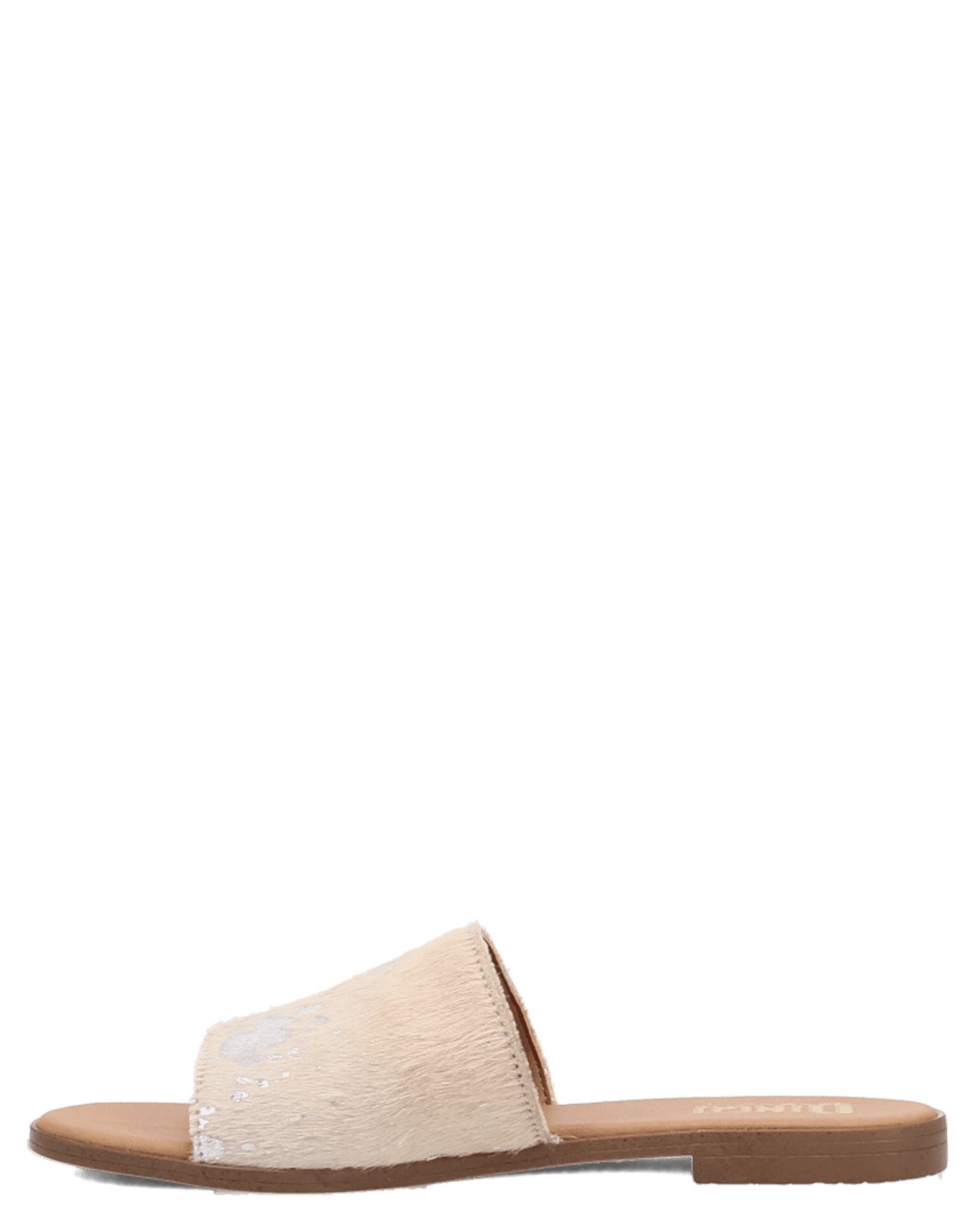 Experience the unique with Moo Moo. These sandals, crafted with luxurious hair-on-hide and accented with shimmering metallic details, are a statement piece that will turn heads wherever you go.