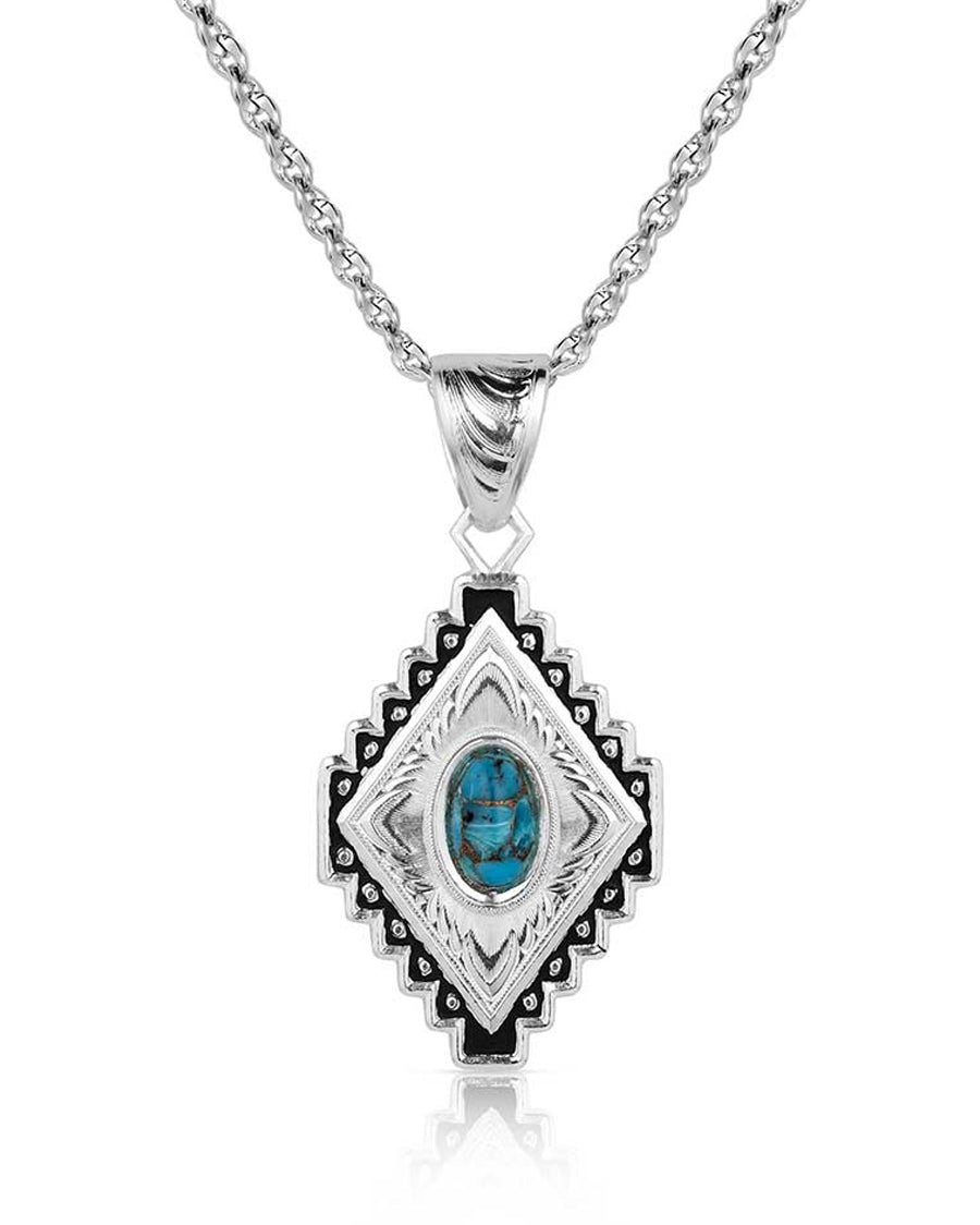 The romance of the West is at the forefront of the beautiful design in the Diamond of the West Turquoise Necklace. The pendant of the necklace is a brilliant silver tone diamond shape with a stepped edge featuring dark paint accentuating the design. The center of the pendant is a bright silver tone with detailed bright cut engraving that frames an oval shaped compressed turquoise stone with copper. The engraved bail secures the pendant to a 22 inch chain to finish the piece. Stone color will vary.