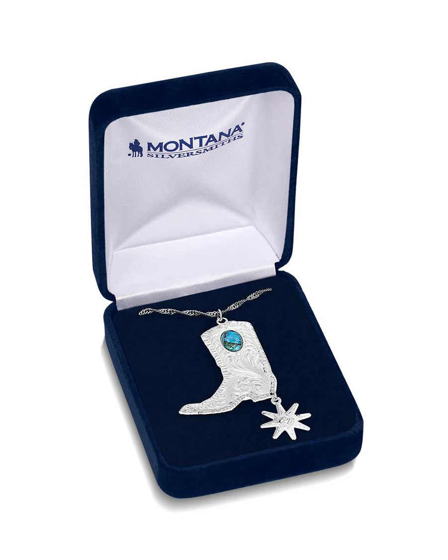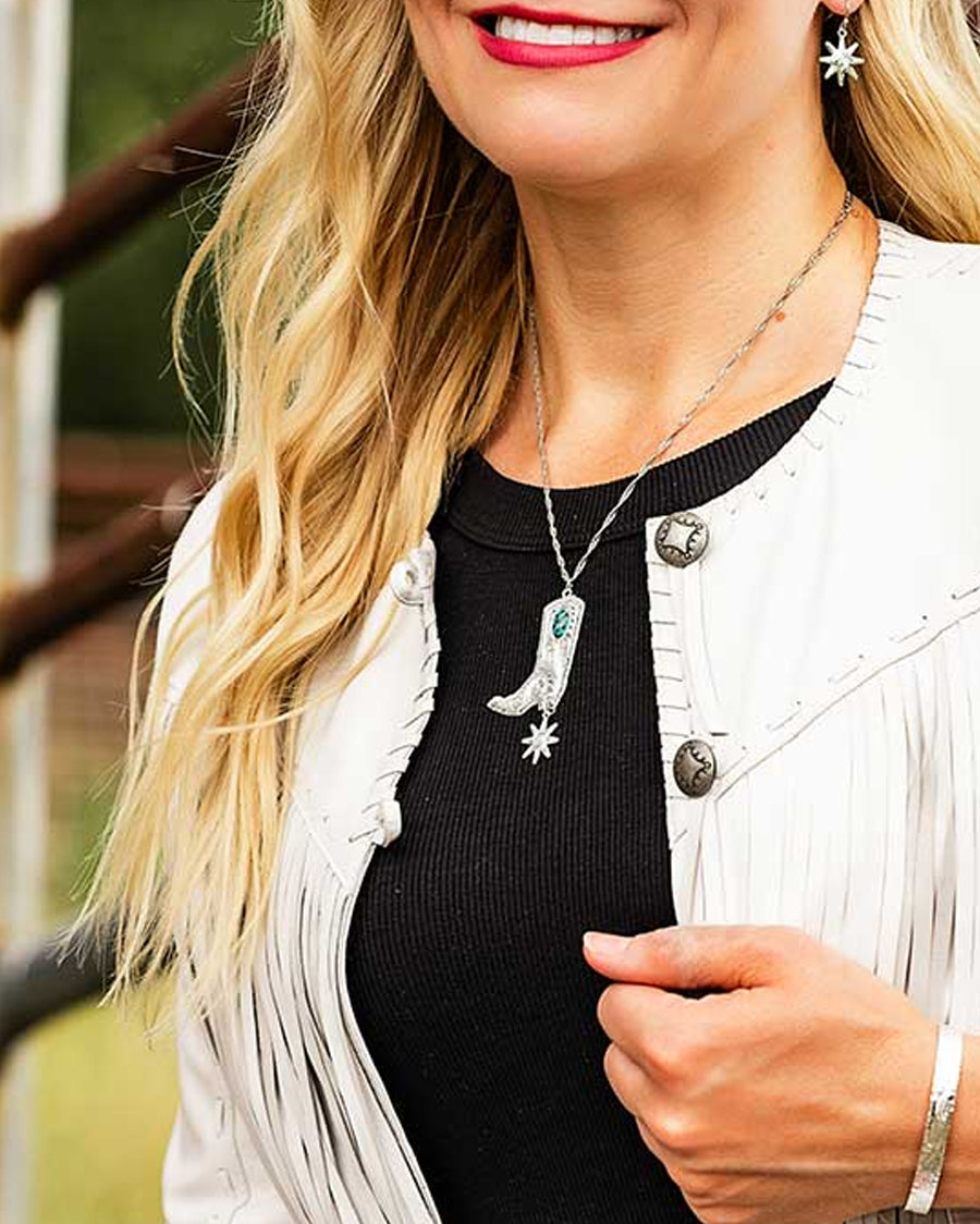 Carry a piece of the West with this stunning necklace. The Chiseled Boots & Spurs Turquoise Necklace features the silhouette of a cowboy boot with a bright silver finish. Through the center is a bright cut engraving and a chiseled edge. Towards the top of the boot is an oval shaped compressed turquoise stone adding to the design. Giving the piece movement is a silver tone spur charm that dangles off of the heel of the boot. Finishing the piece is a 19 inch silver tone adjustable chain. Stone color will vary.