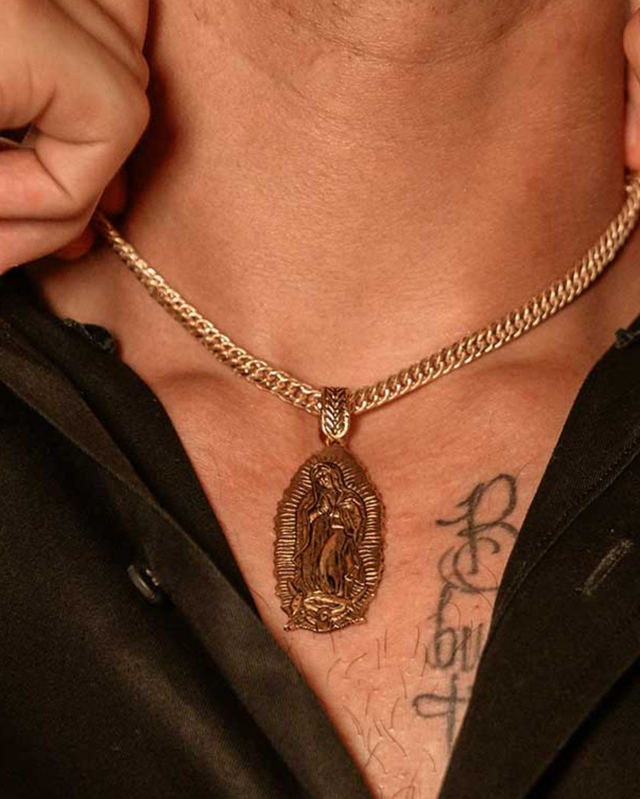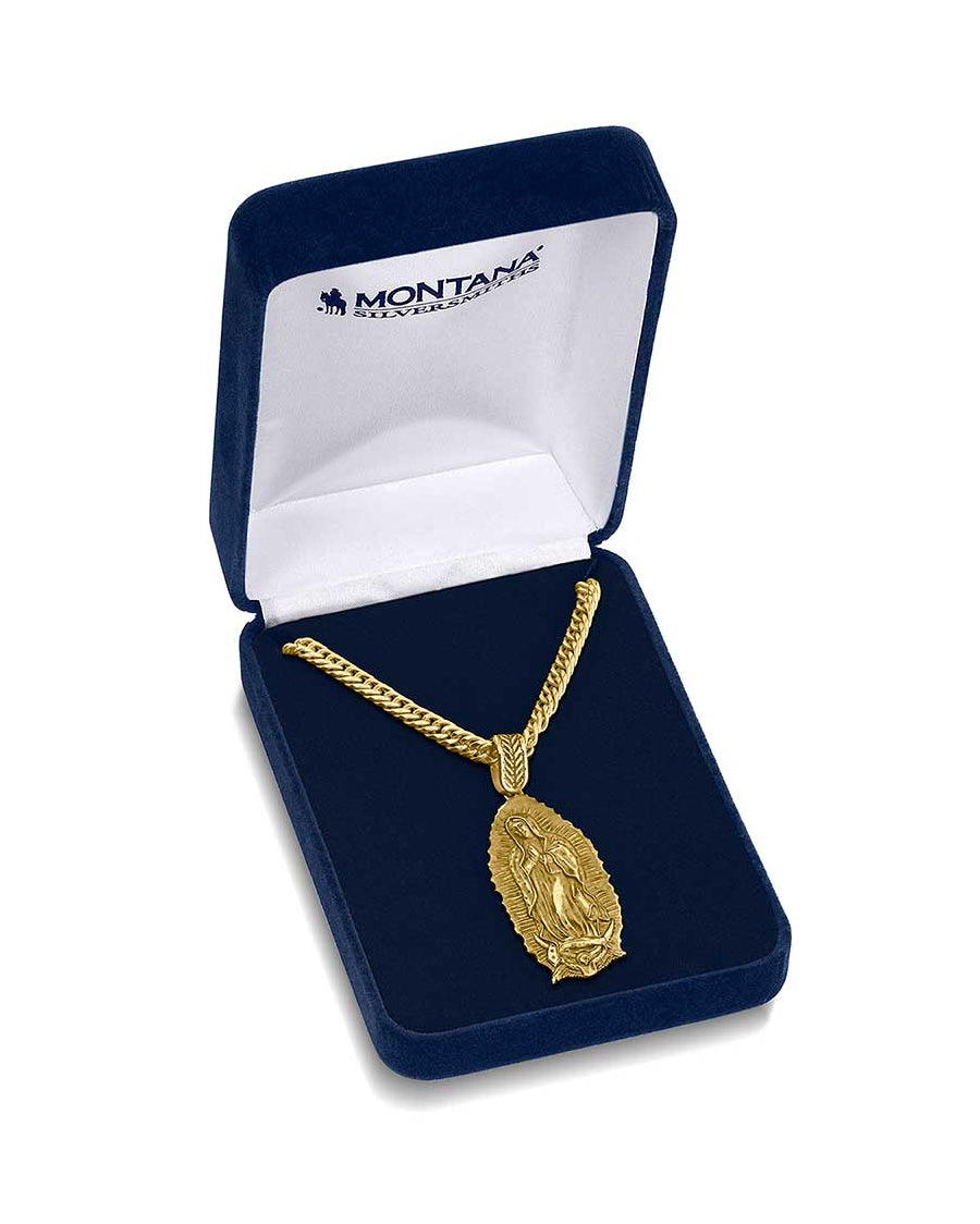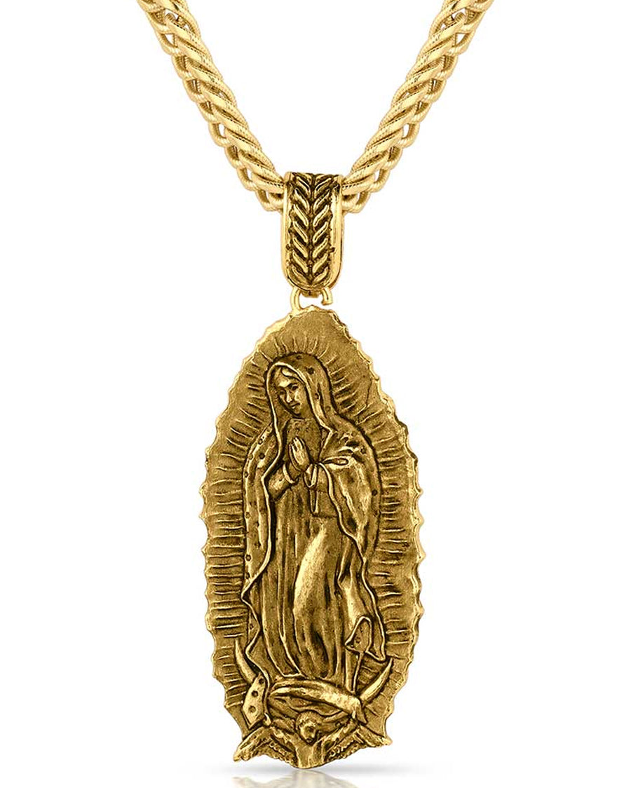 Carry this meaningful symbol with you where ever you go with the Lady of Guadalupe Necklace. The pendant of the design is a sculpted Lady of Guadalupe figure in a brilliant gold finish. A dark antiquing on the figure brings out the details and gives the design a statement making look. A gold tone bail has detailed etchings to add a bold look. A 24 inch gold tone wheat chain finishes the design.