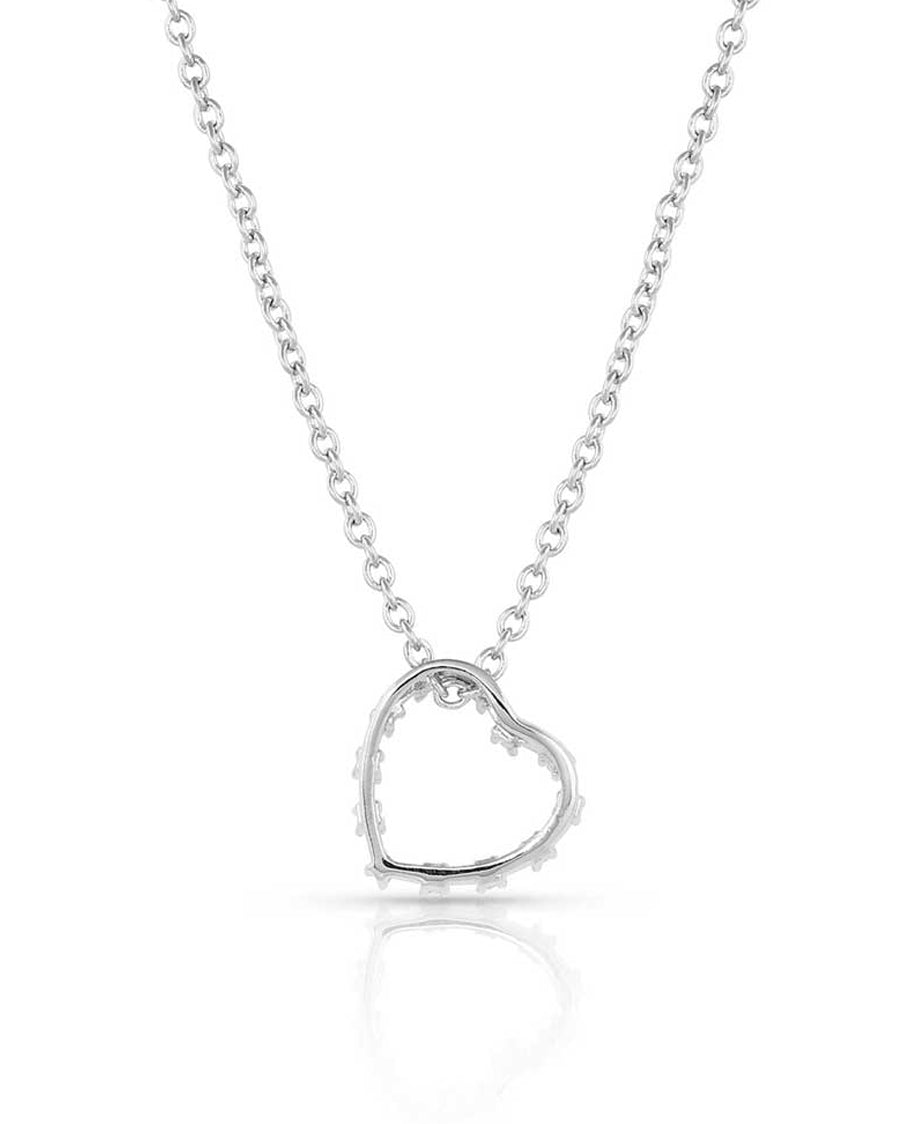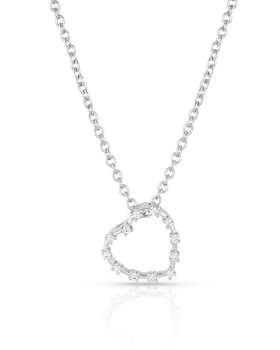 Delicate, dainty, and pulling all the heart strings! The Hanging On Heartstring Necklace shimmers in the light. It is silver-toned, hangs from a 16 inch chain and holds a heart suspended lop-sided for a whimsical feel. The heart is framed in studded crystals.
