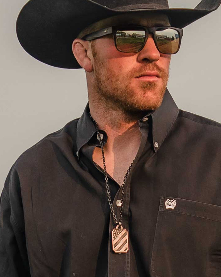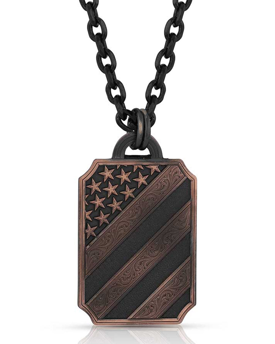 Our All American Bronze Necklace is a beaut! This pendant necklace is squared with clipped corners. It is bright on one side with a bronze-finished panel of Montana Silversmiths signature bright-cut engraving. It holds the American flag with delicately etched stars and stripes with some of the stripes holding filigree to represent western heritage and hangs from a 28 inch chain.