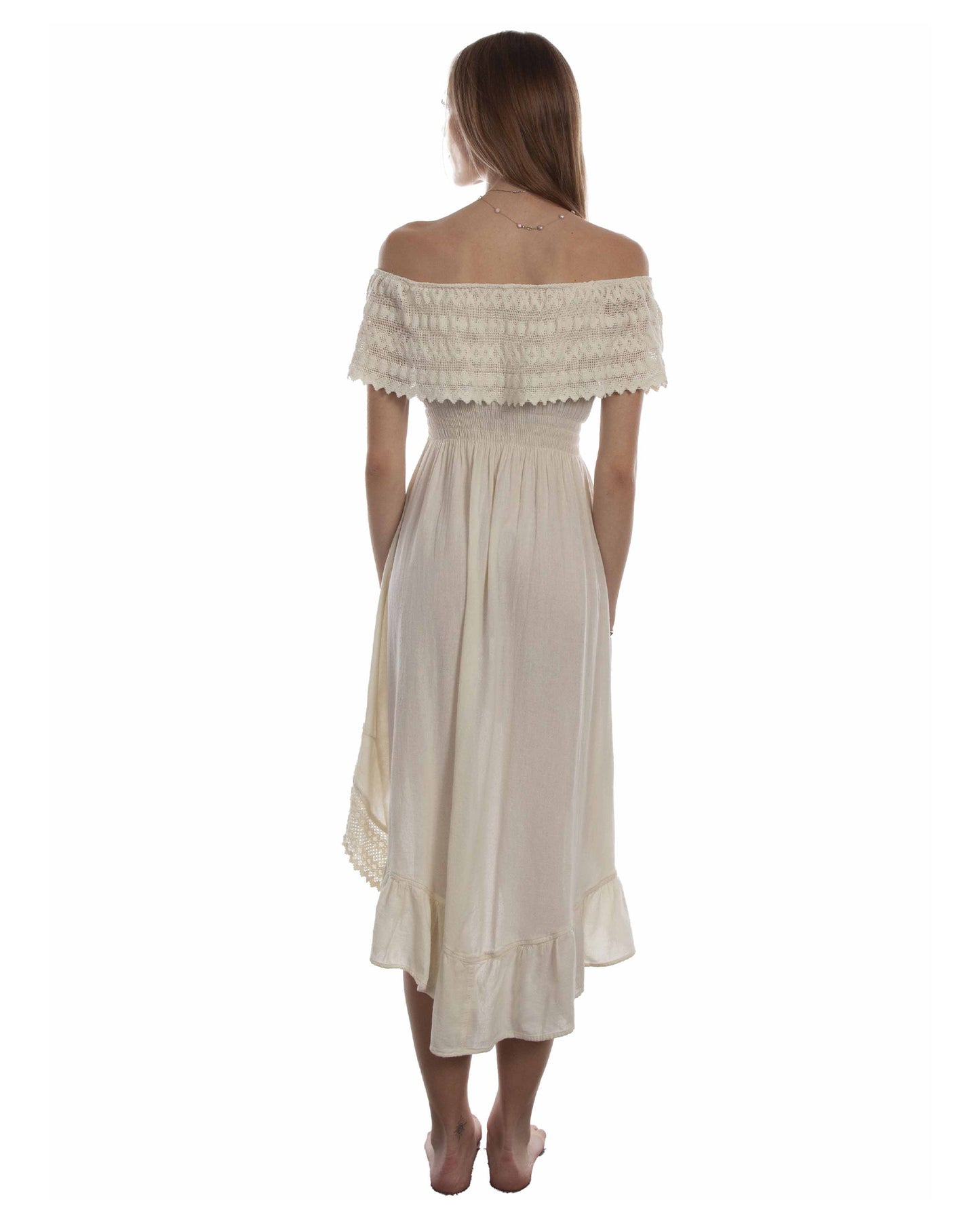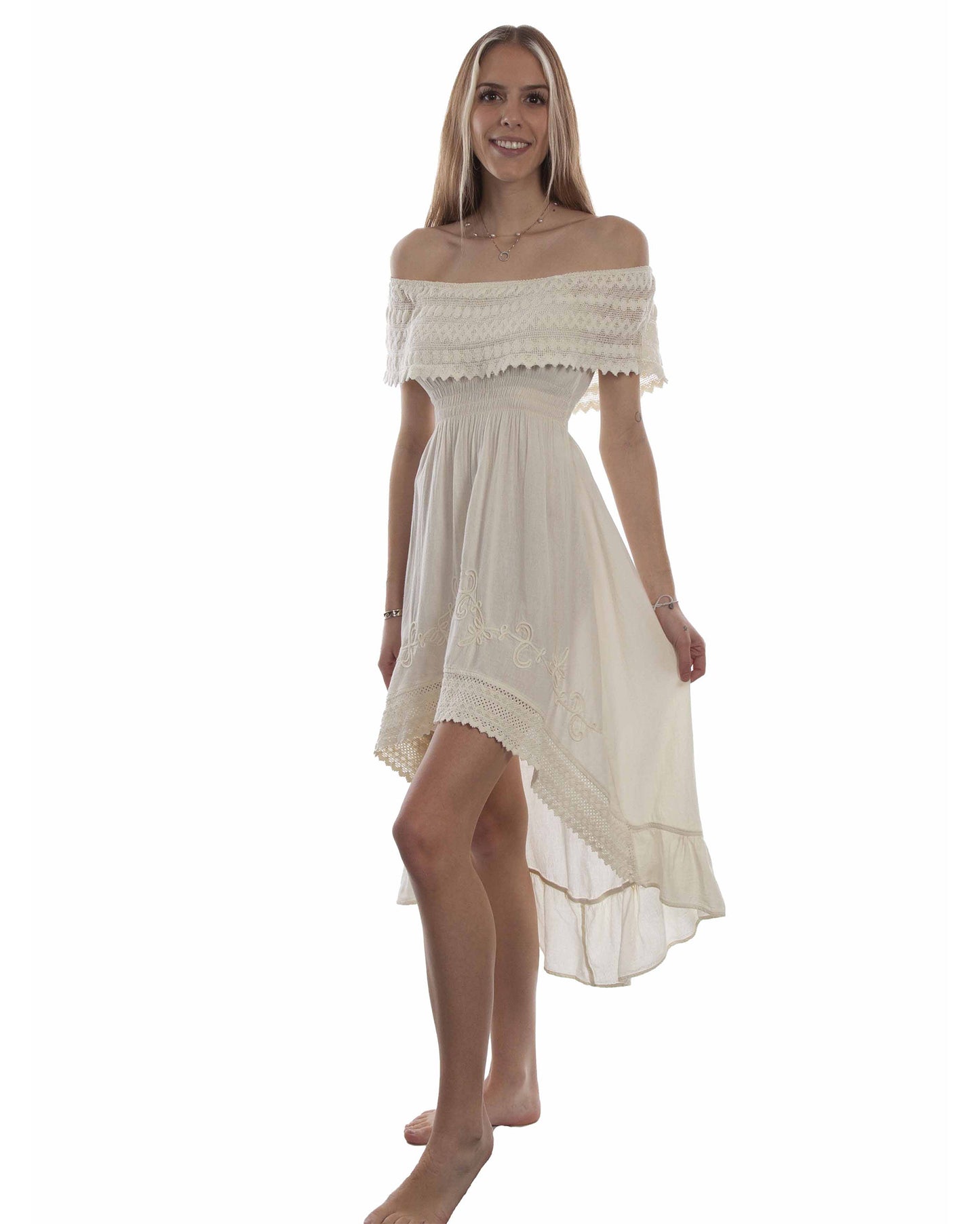 This dress is designed for both style and comfort. The elastic knit waist and delicate machine wash make it a practical and effortless choice for everyday wear. With its romantic off the shoulder design and intricate lace and soutache details, this dress is sure to make you stand out in any crowd. And with its 100% cotton material, it's both durable and breathable. Don't miss out on adding this versatile and stylish piece to your wardrobe.