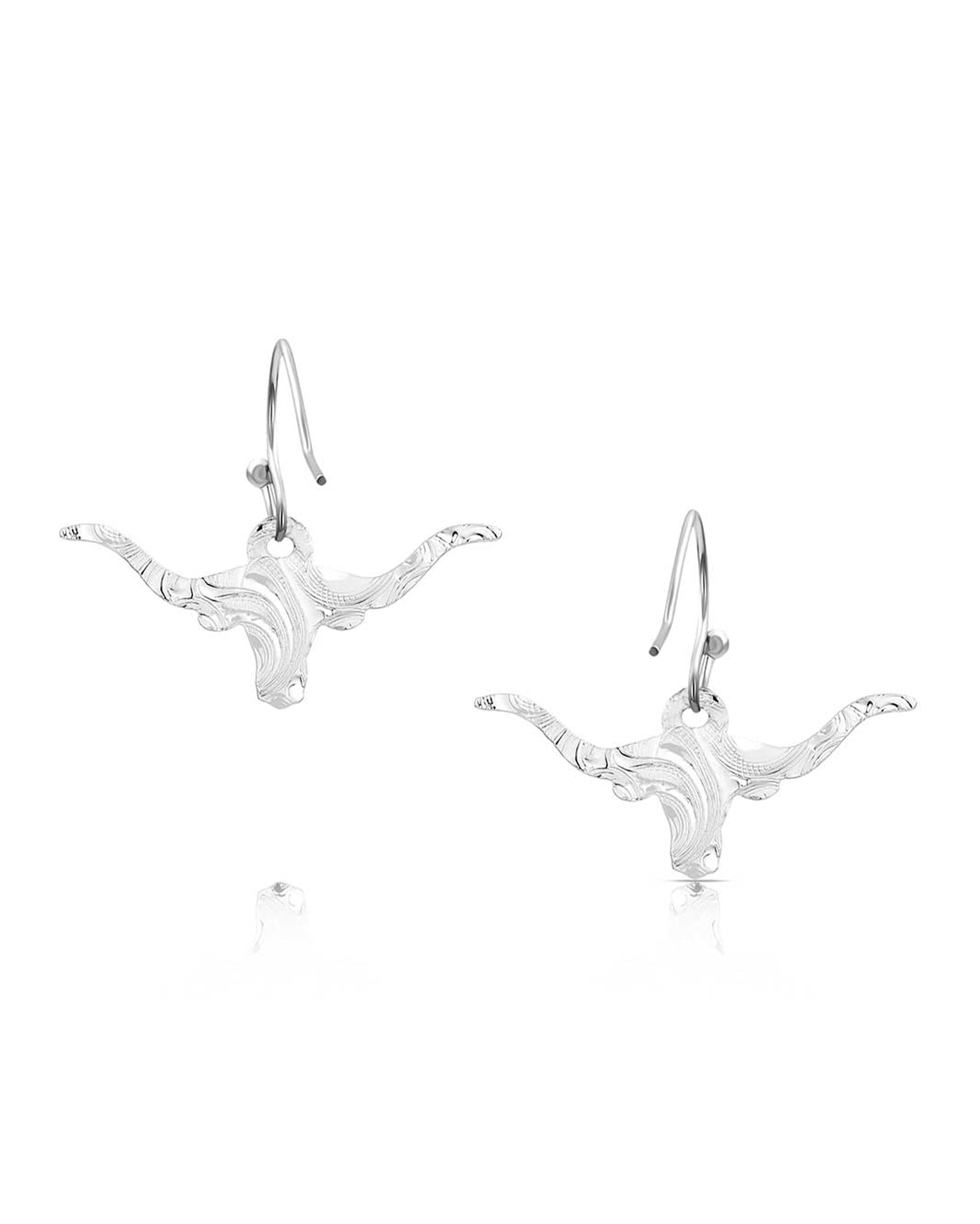 Made for the West, these simple yet stunning longhorn earrings are a great addition to your collection. The design of the earrings is a silhouette of a longhorn in a brilliant silver tone. Detailed bright cut engraving covers the background of the piece.