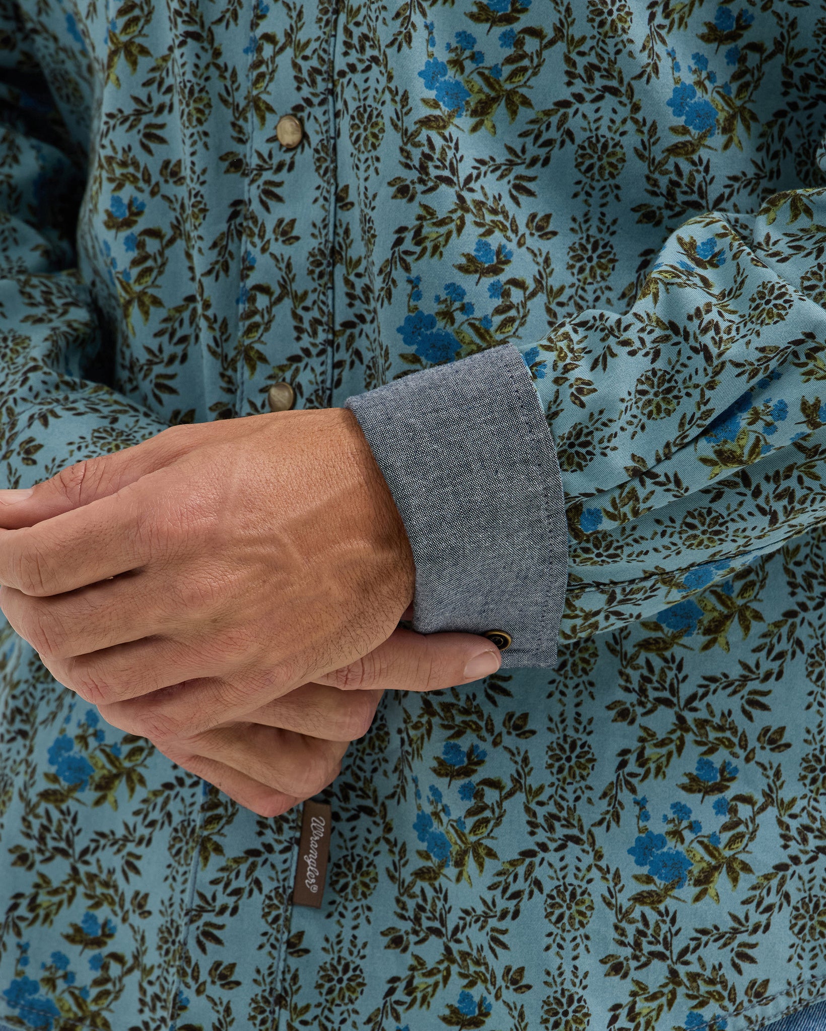 Serious on style and comfort. Look good while feeling good in the men's Wrangler Retro® long-sleeve western snap printed shirt. This contemporary take on the classic style you love comes packed with all the distinctive details, including pointed front and back yokes, single-needle stitching at the placket, modern fit, contrast trim, two snap cuffs, and two chest flap pockets with snaps. This long-sleeve snap shirt features a modern fit and it's crafted from cotton for comfort, minimal wrinkling, and long-lasting looks. Complete the outfit with Wrangler Retro jeans.