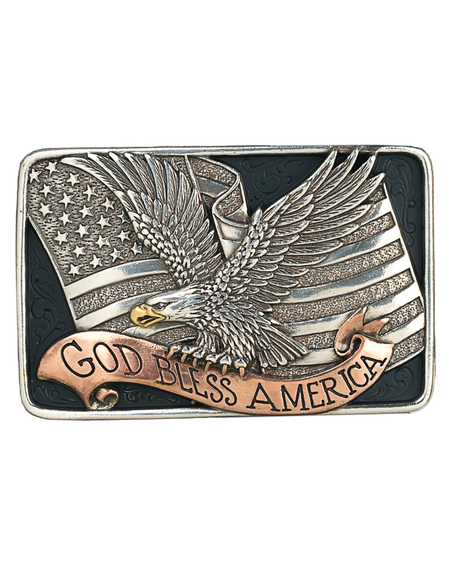 Beautifully designed patriotic buckle by M&F Western Products. Rectangle buckle with an American flag and bald eagle design in the center. God Bless America is written in copper across the bottom against a matte black background with a scrolling pattern.