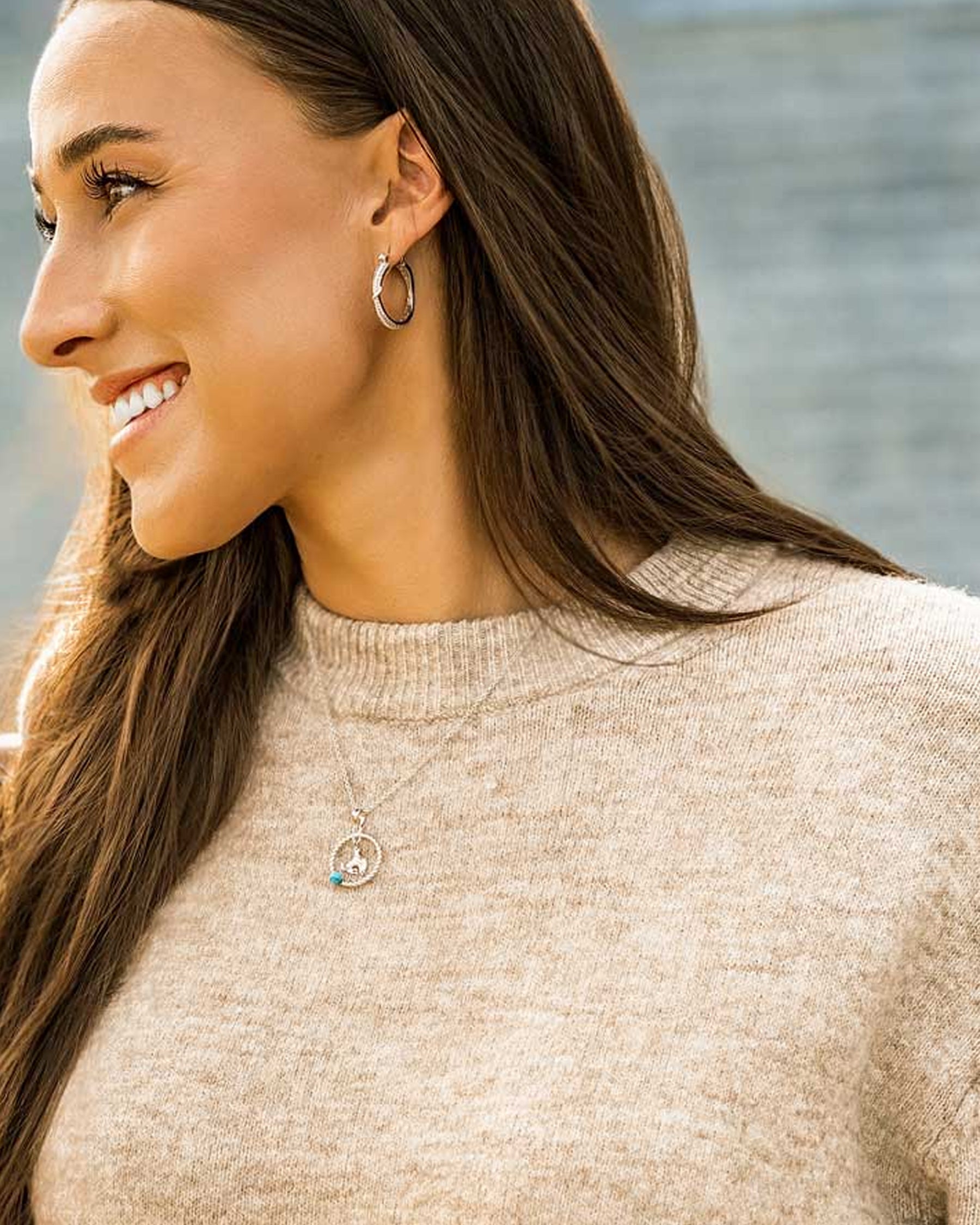 The Rodeo Blues necklace features a braided circular frame and a vibrant turquoise bead that adds a playful pop of color. The pendant sits on a 19 inch chain to complete the design. Stone color may vary.