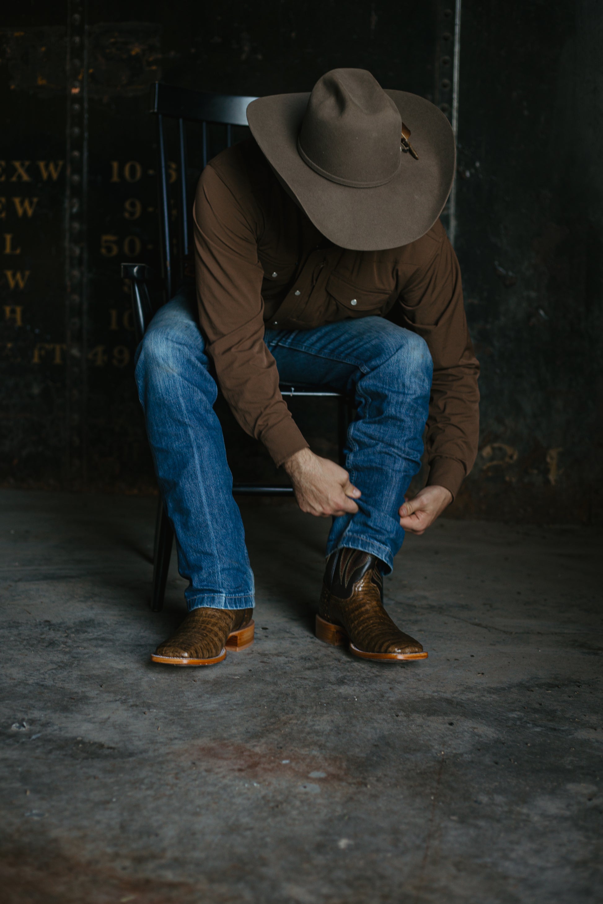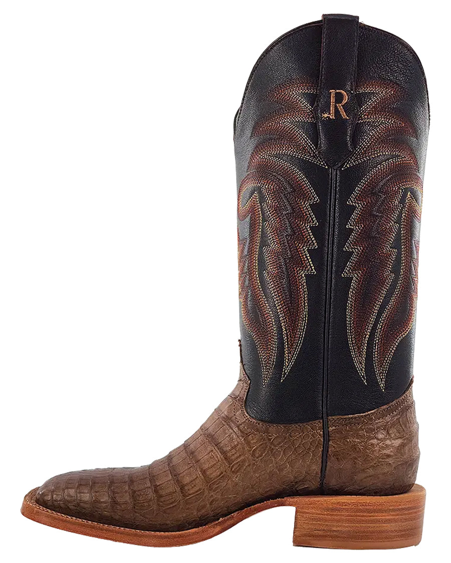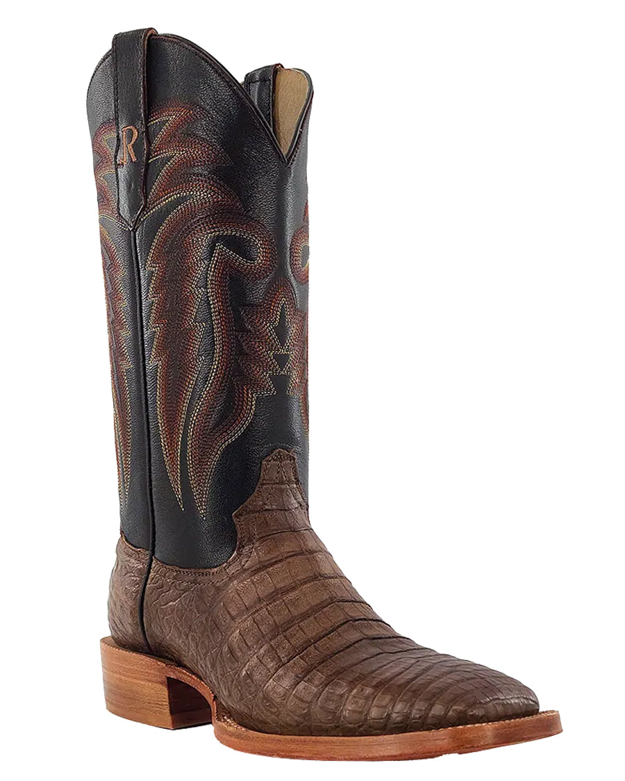 R. Watson presents these coco caiman belly and espresso goat exotic western boots. These boots have a 10 row stitch pattern, R. Watson comfort system, all leather stacked heel, counters, solid steel shank, and 10 iron outsole. 13″ total in height.