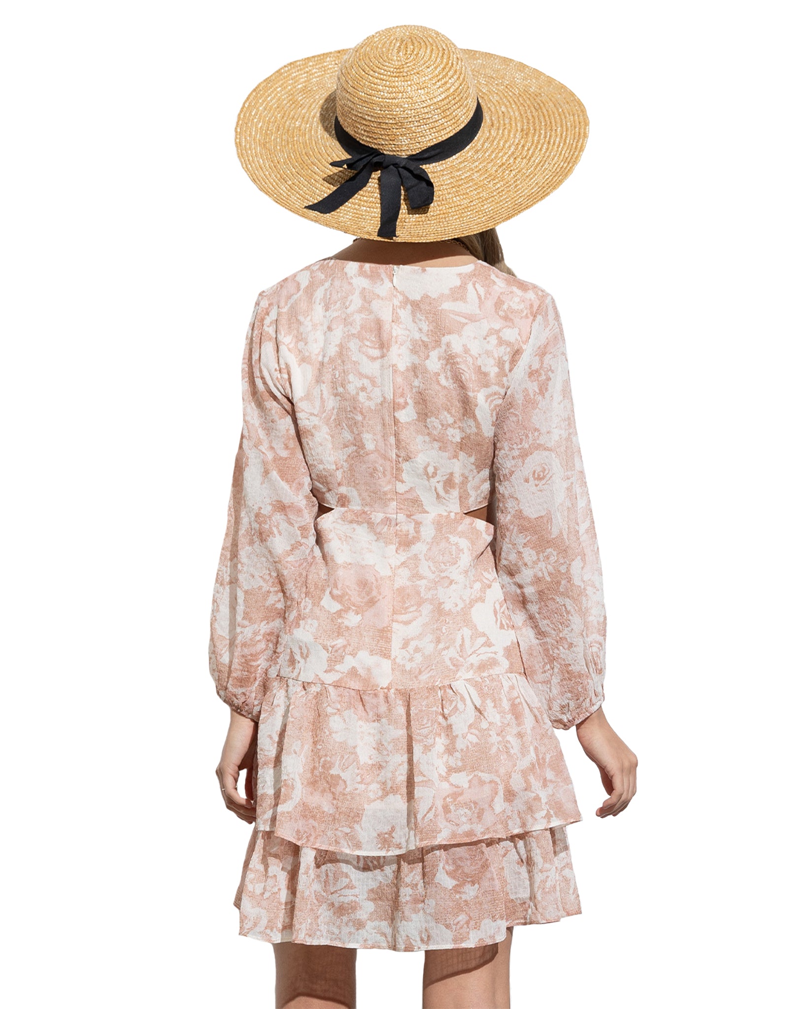 This mini dress features sheer sucker chiffon fabric, side cutouts, a front invisible zipper, and ruffle accents for an elegant and modern look.