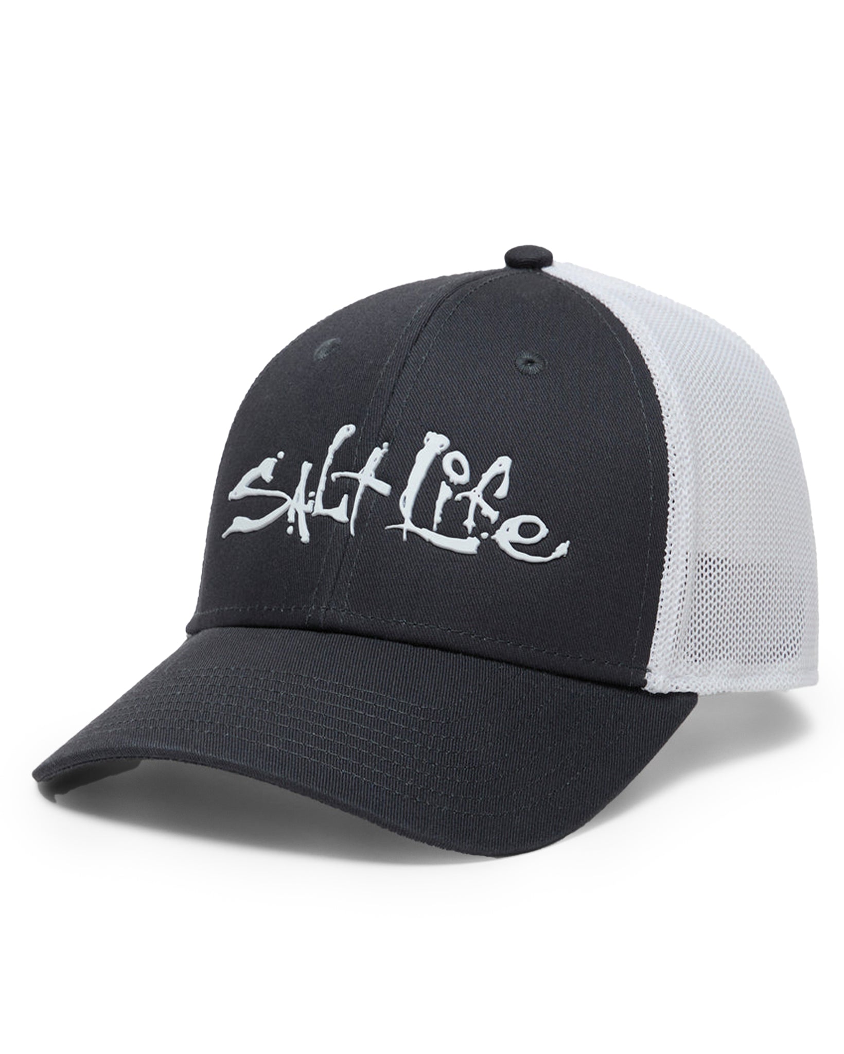 The Fish Dive Surf cap offers a stretch fit with a sleek, low-profile design, crafted entirely from 100% cotton twill. It showcases sonic-welded logos on both the front and back. Designed for comfort, this Salt Life hat includes breathable trucker mesh at the rear and a pre-curved bill.