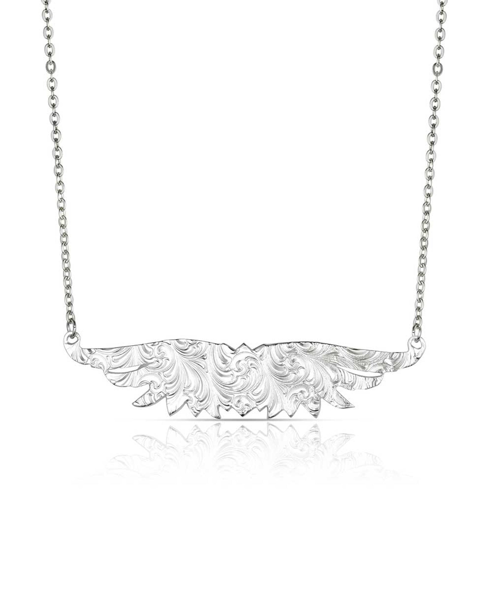This exquisite accessory showcases Montana Silversmith's commitment to quality craftsmanship and authentic Western style. The necklace features an intricate feathered wing design, symbolizing freedom and resilience. Suspended on an 18.5-inch split chain, this versatile piece adapts effortlessly to various necklines.