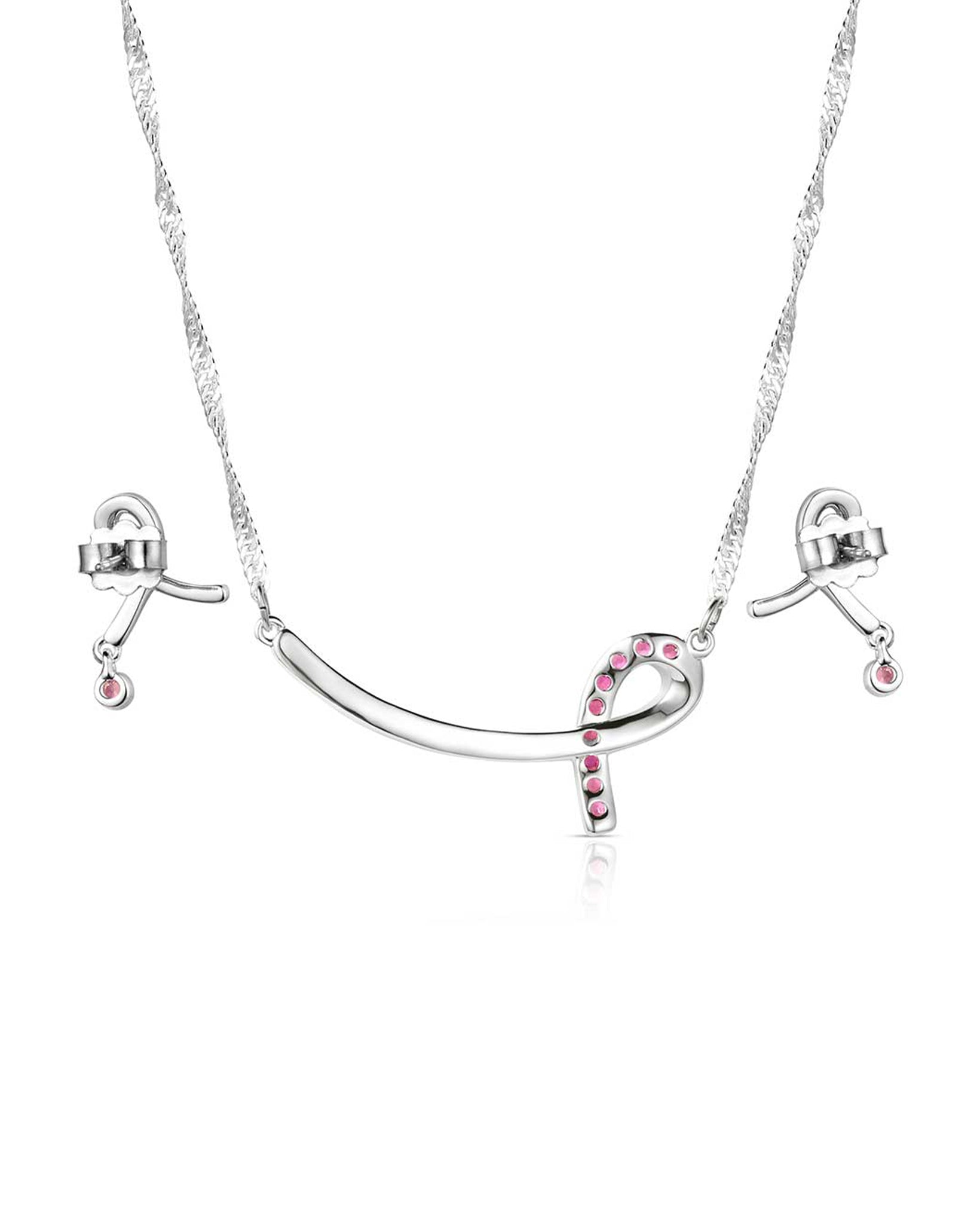 Be proud and strong with the Tough Enough to Wear Pink Hope Rope Jewelry Set, created in support of breast cancer awareness. The silver tone necklace features a ribbon shape formed by a pink painted rope, topped with a clear cubic zirconia crystal for added sparkle.