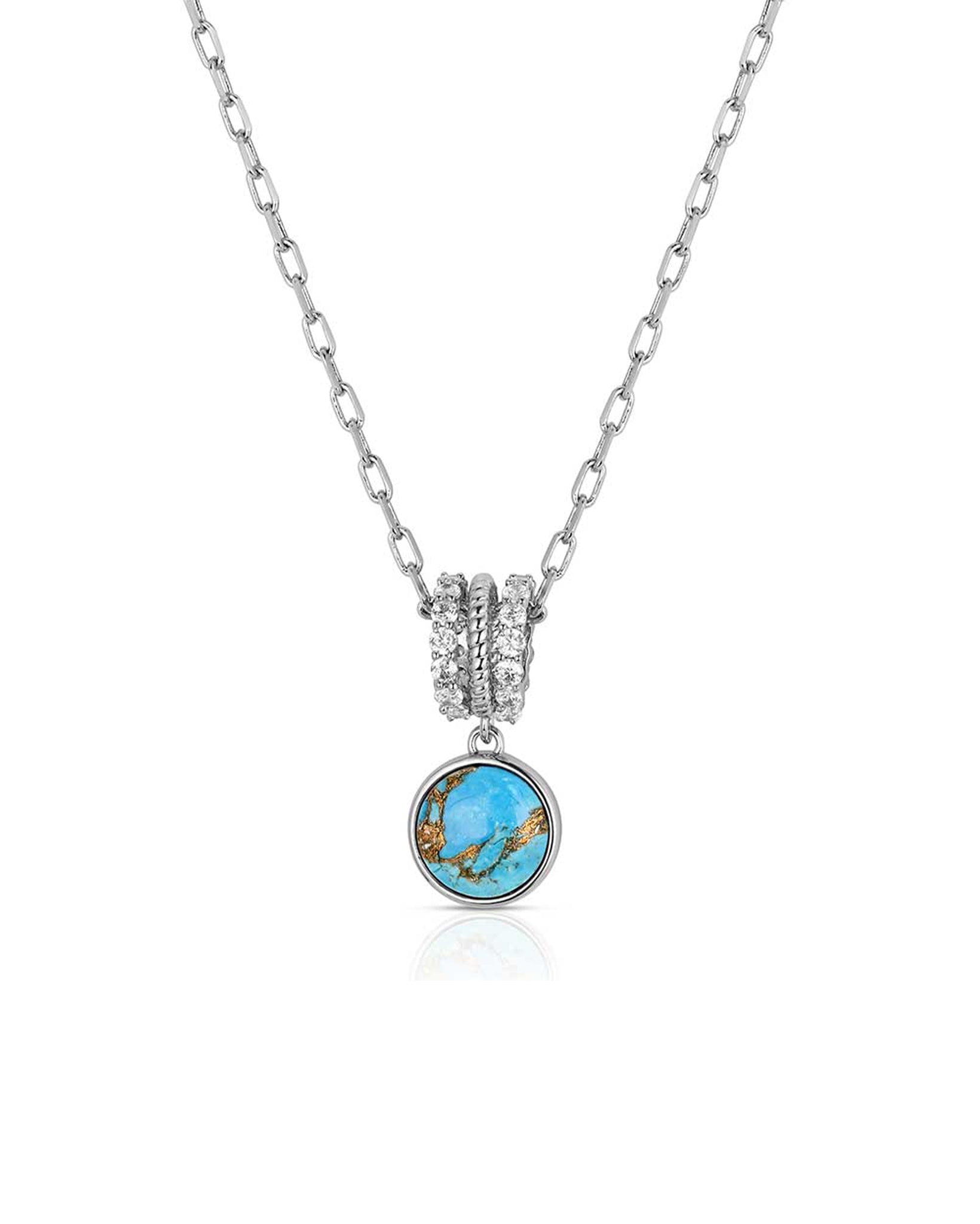 Make a statement with the Trailing Turquoise Necklace. This necklace features a 16-inch silver-tone chain with a 3 inch extender, secured by a lobster clasp and paperclip link design. Embellished with crafted turquoise and crystals, the circle-shaped pendant offers a glamorous design perfect for standout style.