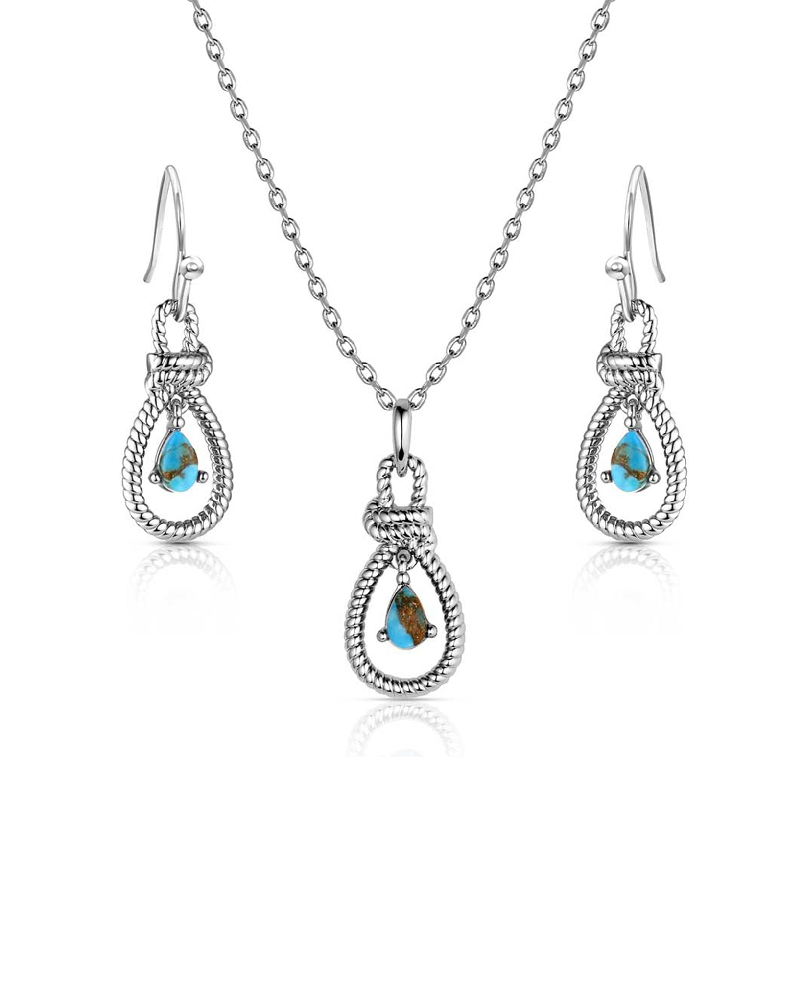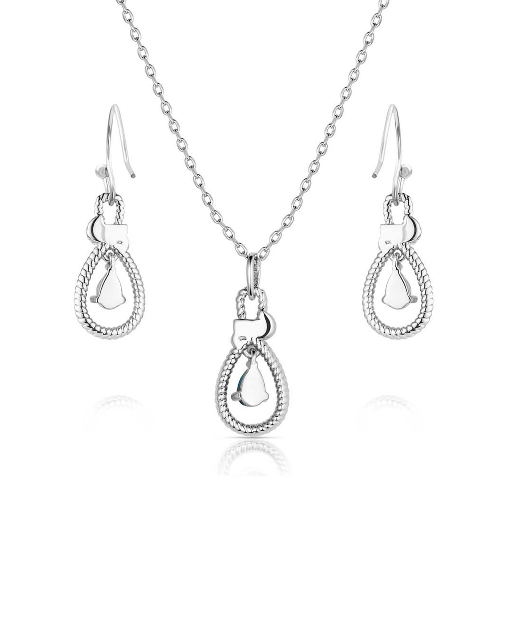 Refined with a western soul, this teardrop turquoise necklace and earring set delivers elegance with an edge. The pear-shaped stones are encased in a sparkling setting, offering a graceful silhouette perfect for weddings, rodeos, or everyday Western glam. The earrings in the set feature hypoallergenic post back wires, and the matching necklace has an 18-inch silver-tone chain, completing the set.
