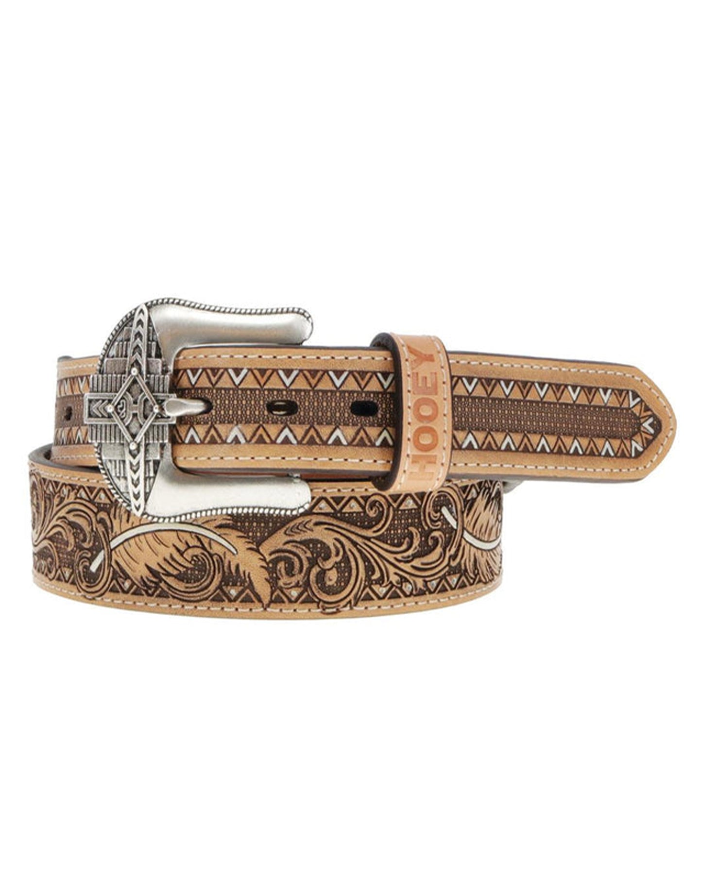 This Hooey original men's belt features natural leather, detailed feather and filigree embossed with brown and ivory accents.