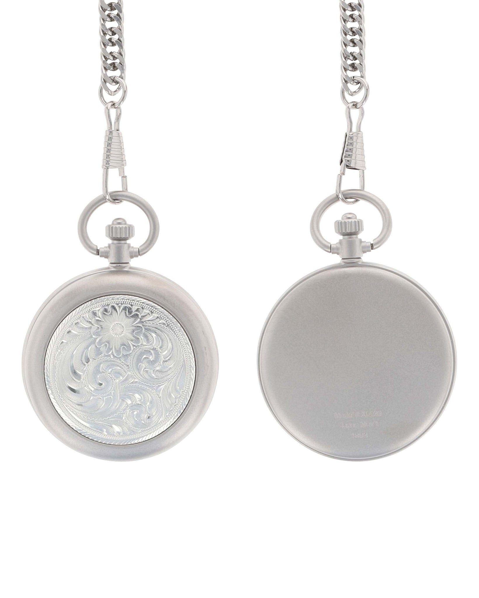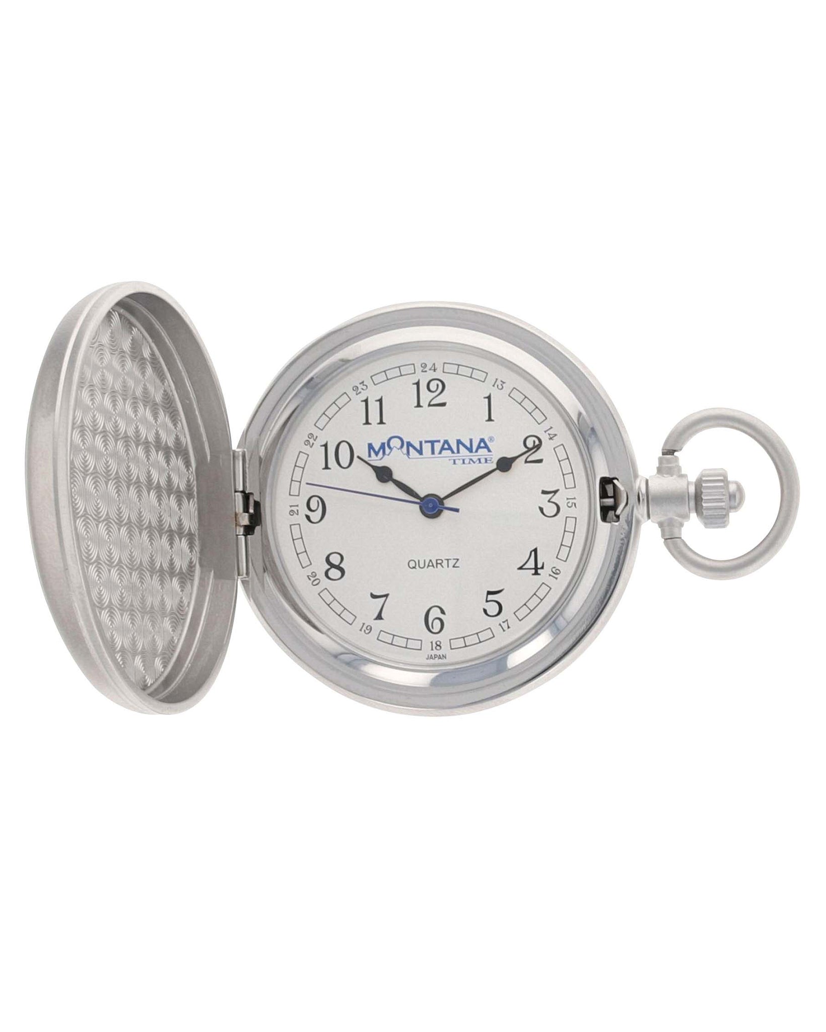 This compact hunter’s case pocket watch features an intricately engraved bright cut silver inlay on its cover. The inside lid showcases a finely detailed circular engraving pattern, while the face proudly displays the Montana Time logo.