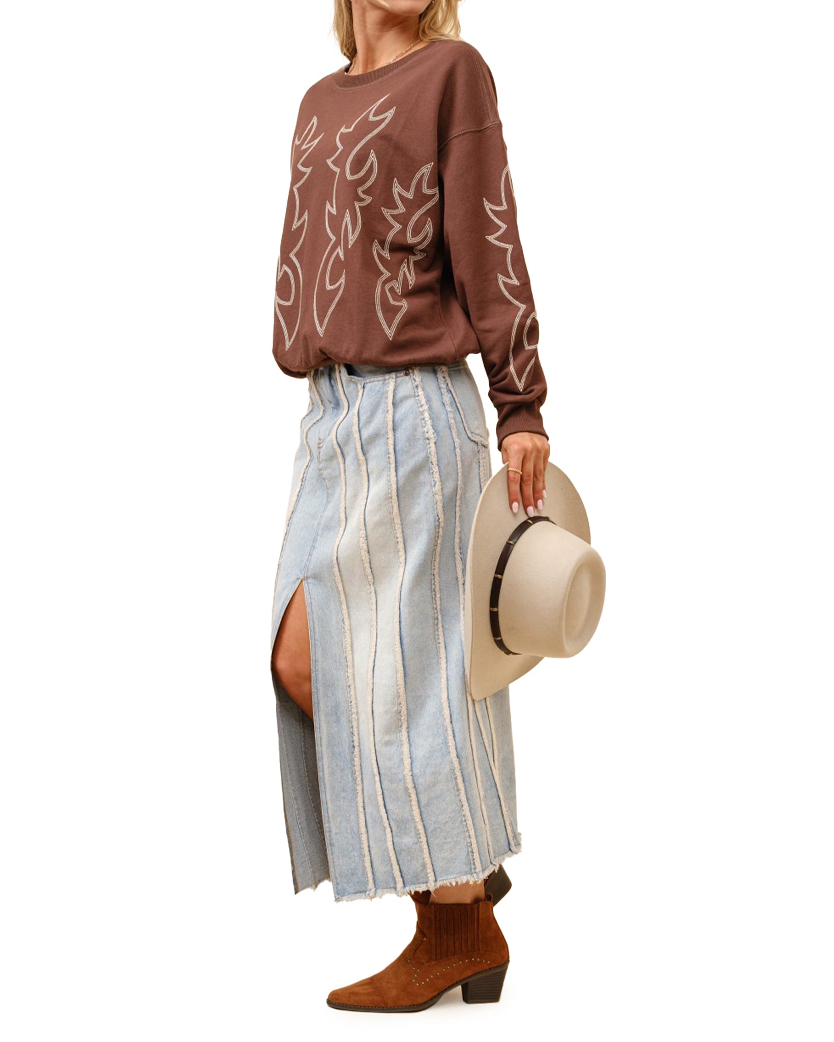 Featuring a distinctive Western boots stitch pattern, this pullover sweatshirt combines comfort with authentic ranch-inspired design.