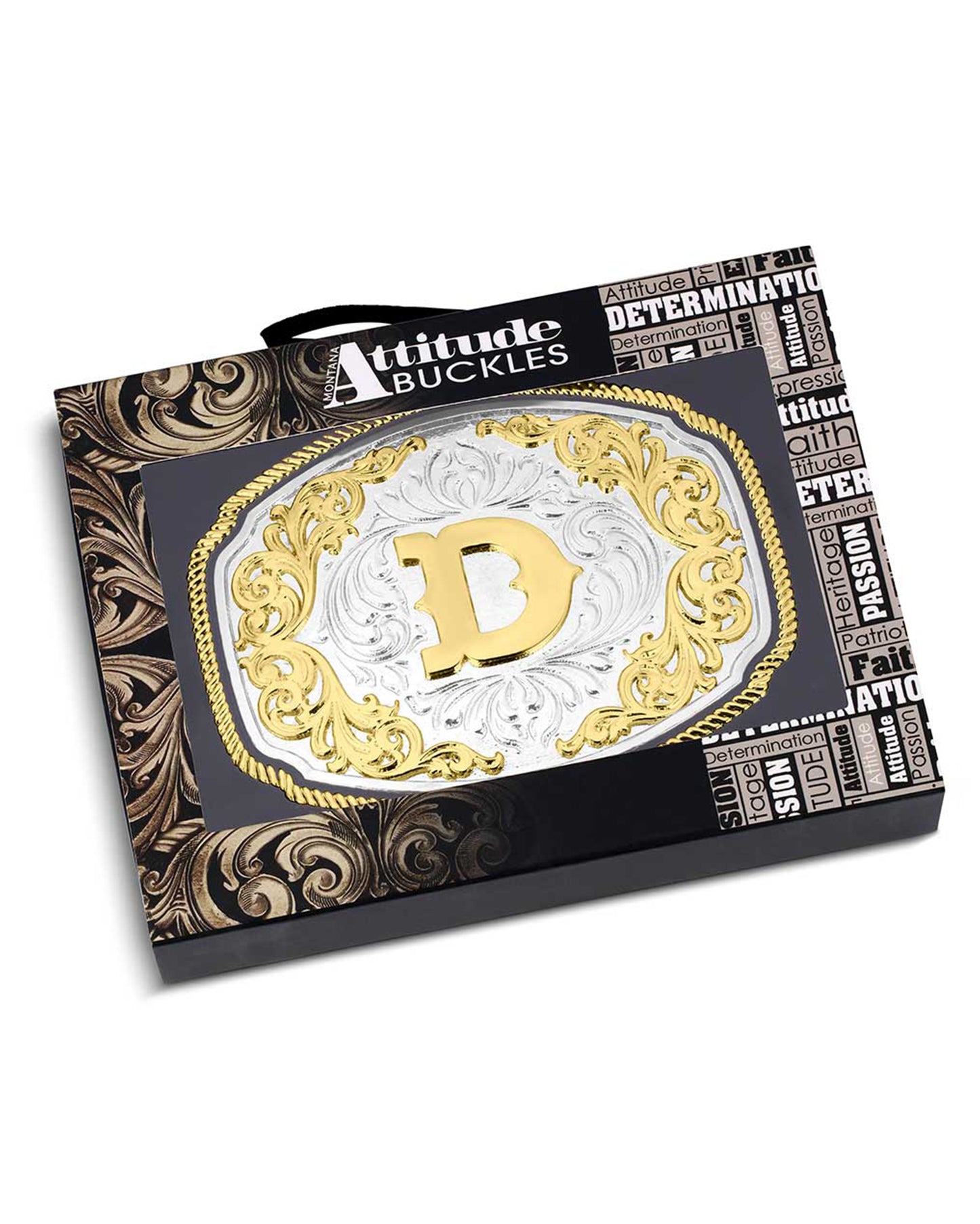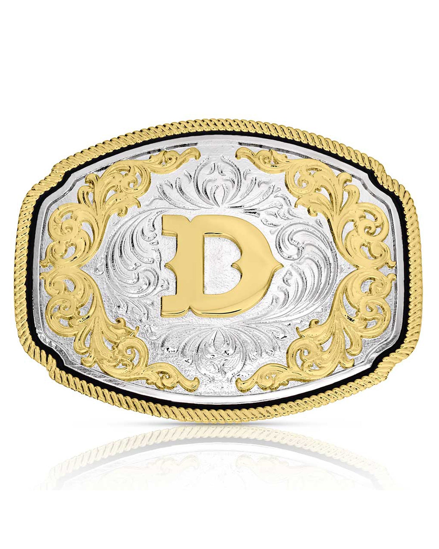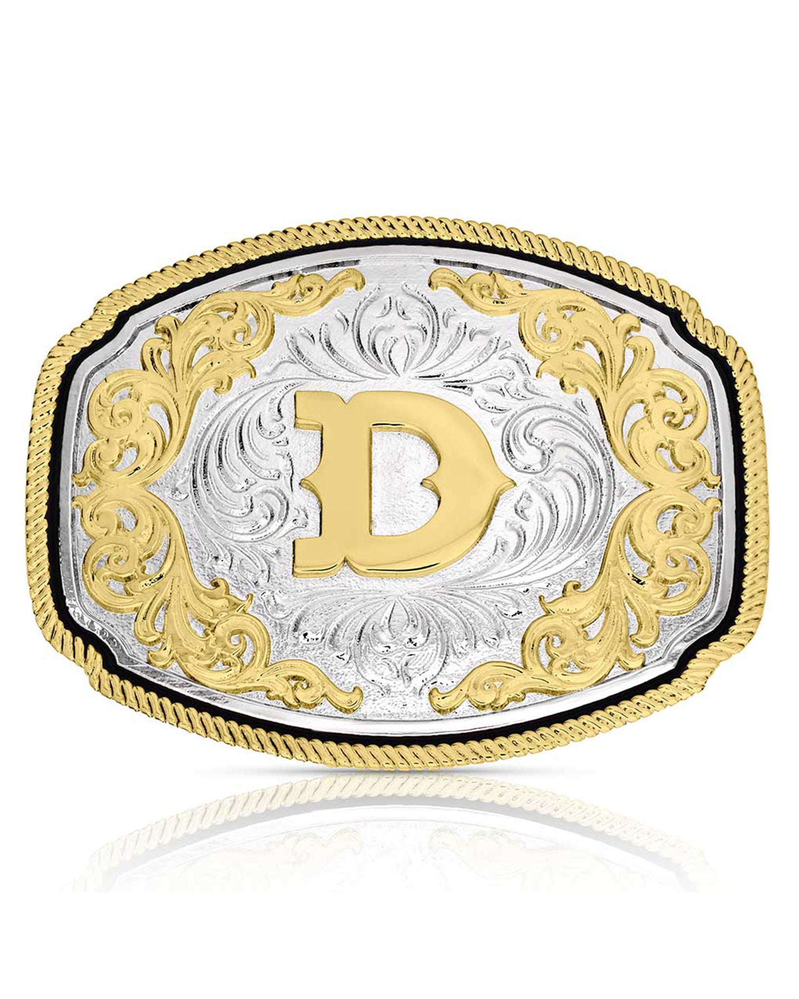 Personalize your style with the Silver Engraved Gold Initial Buckle. This buckle features a gold tone initial as the center piece. Silver engravings create the backdrop for the buckle. Gold tone filigree surrounds the initial in the center, creating a mesmerizing look. A gold tone rope border completes the design. There is only one you, show off your individuality with a unique initial buckle. This cast buckle has a standard 1.5 inch belt swivel.