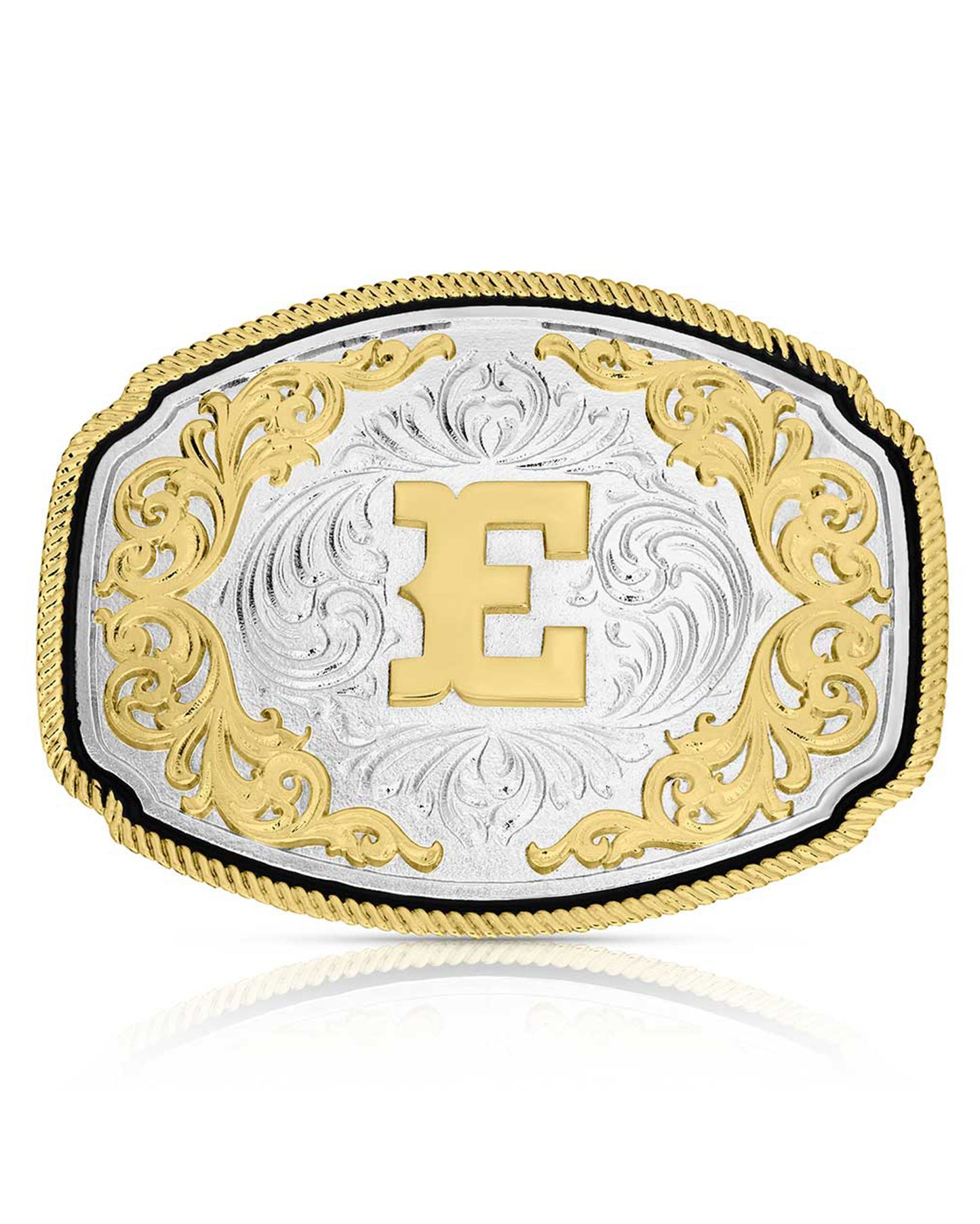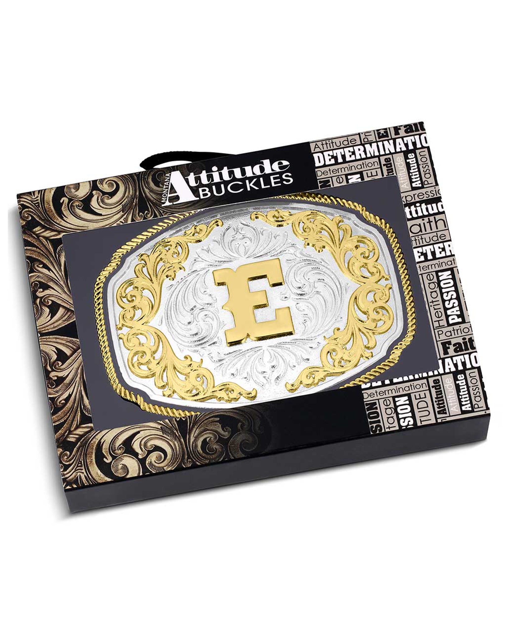 Personalize your style with the Silver Engraved Gold Initial Buckle. This buckle features a gold tone initial as the center piece. Silver engravings create the backdrop for the buckle. Gold tone filigree surrounds the initial in the center, creating a mesmerizing look. A gold tone rope border completes the design. There is only one you, show off your individuality with a unique initial buckle. This cast buckle has a standard 1.5 inch belt swivel.