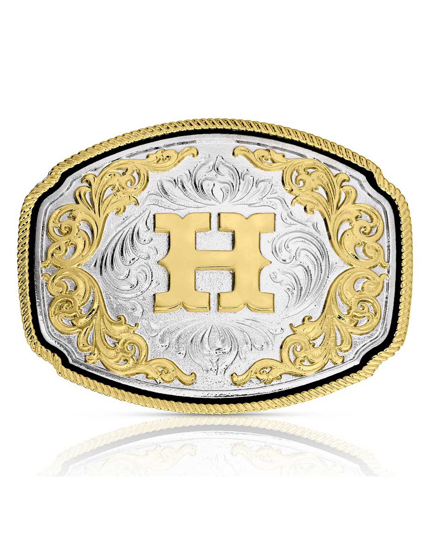 Personalize your style with the Silver Engraved Gold Initial Buckle. This buckle features a gold tone initial as the center piece. Silver engravings create the backdrop for the buckle. Gold tone filigree surrounds the initial in the center, creating a mesmerizing look. A gold tone rope border completes the design. There is only one you, show off your individuality with a unique initial buckle. This cast buckle has a standard 1.5 inch belt swivel.