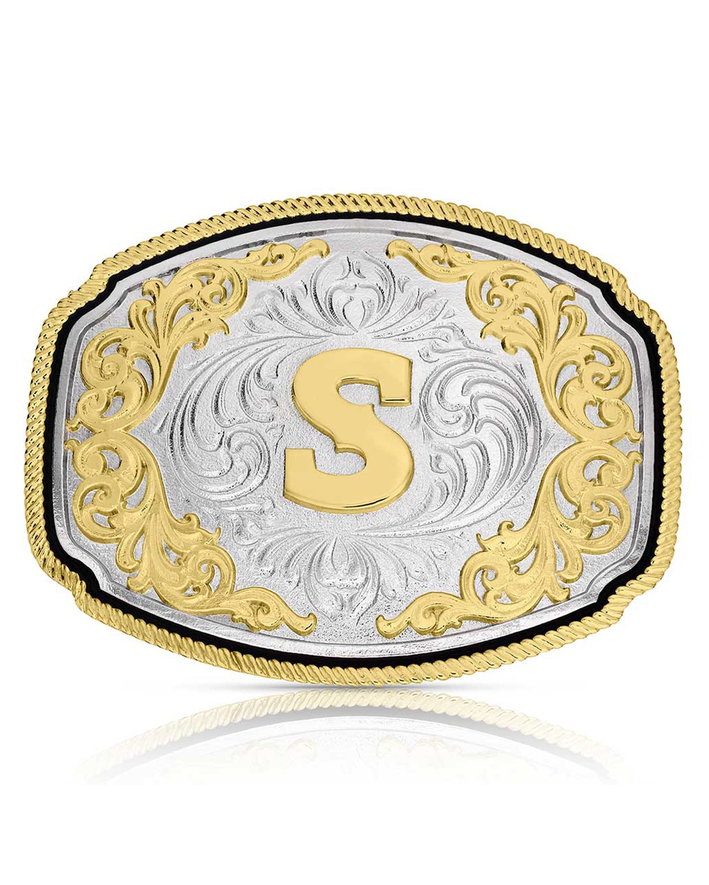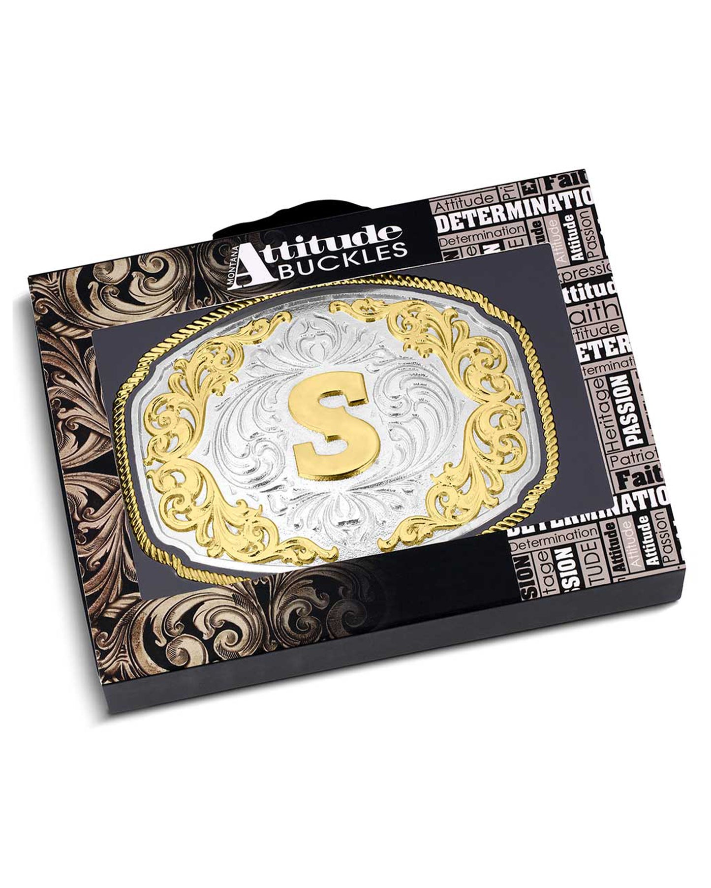 Personalize your style with the Silver Engraved Gold Initial Buckle. This buckle features a gold tone initial as the center piece. Silver engravings create the backdrop for the buckle. Gold tone filigree surrounds the initial in the center, creating a mesmerizing look. A gold tone rope border completes the design. There is only one you, show off your individuality with a unique initial buckle. This cast buckle has a standard 1.5 inch belt swivel.