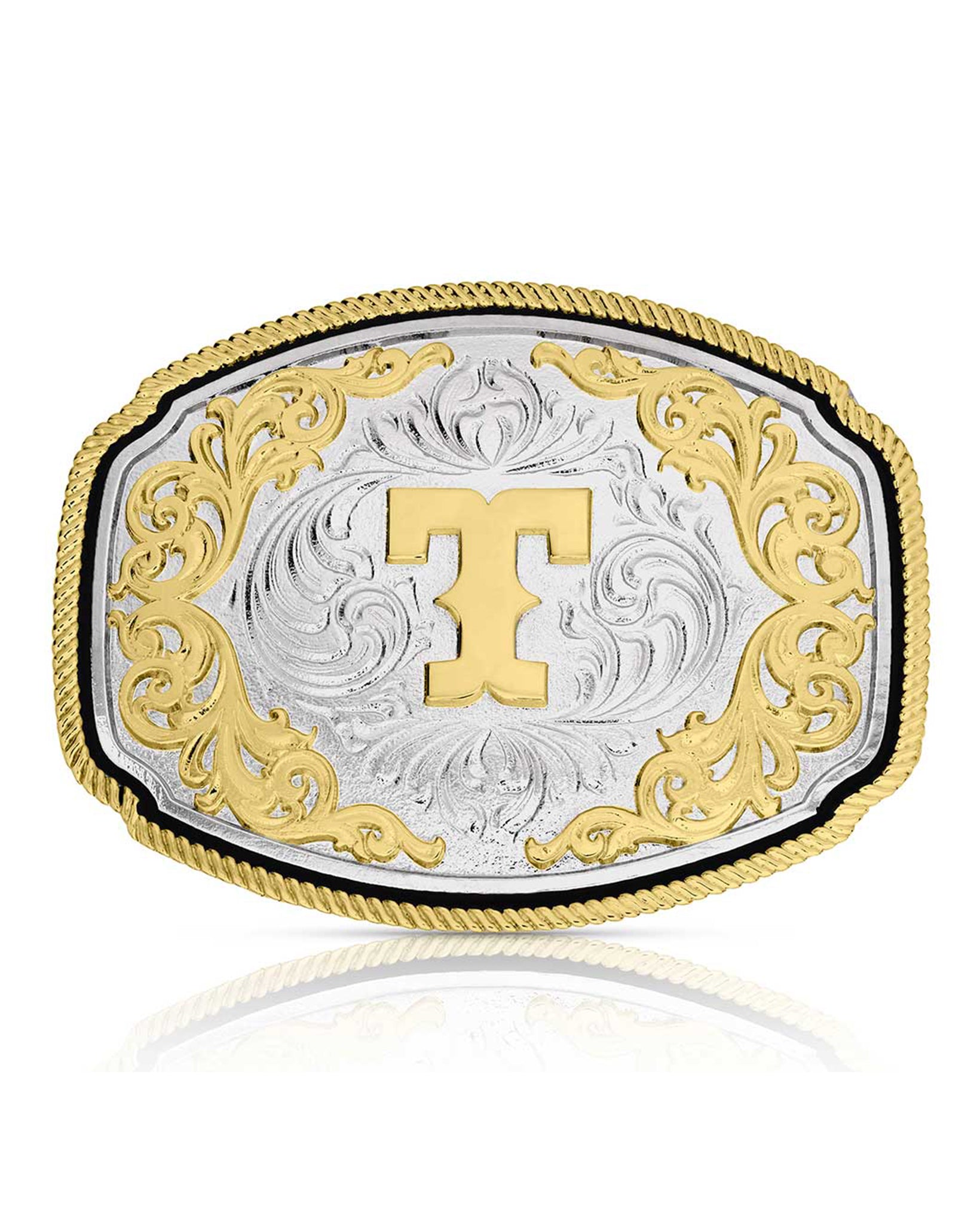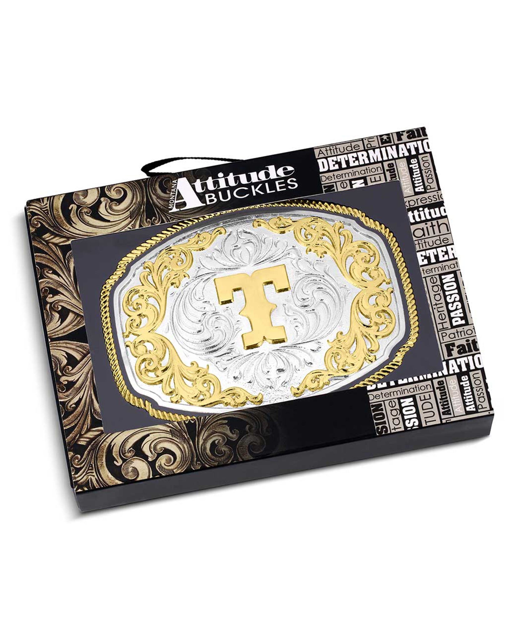 Personalize your style with the Silver Engraved Gold Initial Buckle. This buckle features a gold tone initial as the center piece. Silver engravings create the backdrop for the buckle. Gold tone filigree surrounds the initial in the center, creating a mesmerizing look. A gold tone rope border completes the design. There is only one you, show off your individuality with a unique initial buckle. This cast buckle has a standard 1.5 inch belt swivel.