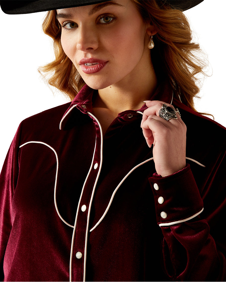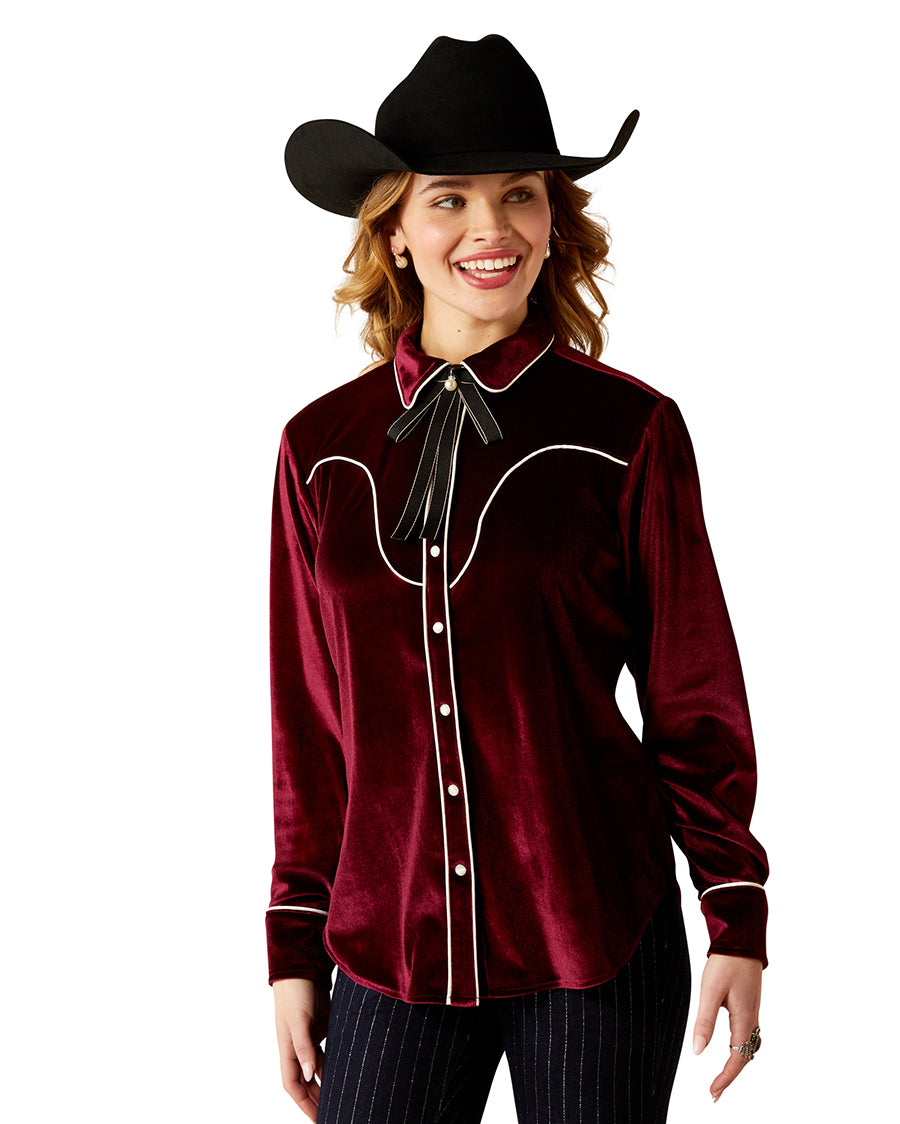 Shine under the arena lights or on the dance floor in this retro rodeo top. Soft velvet fabric and contrast piping nod to decades past, bringing vintage Western vibes to any outfit.