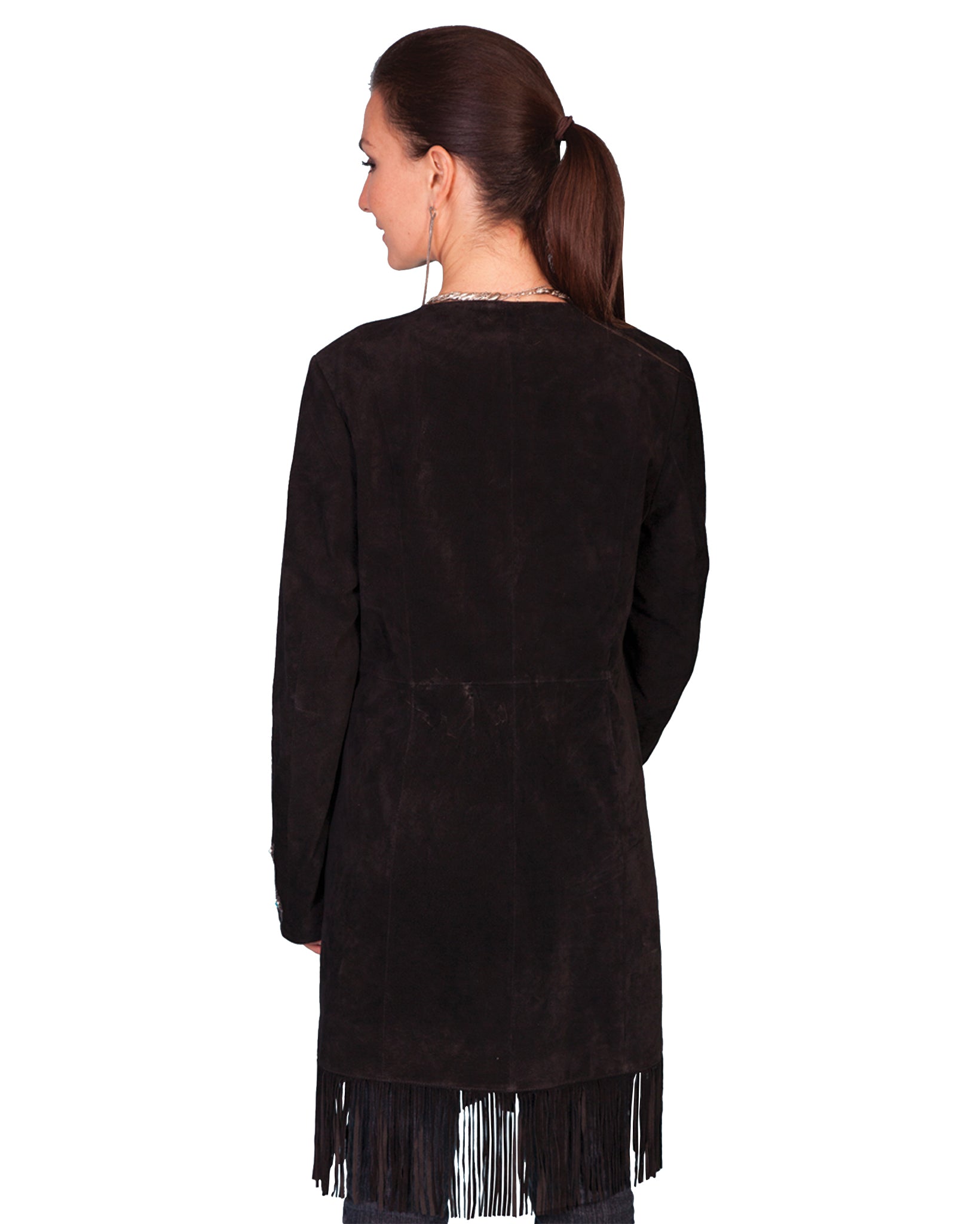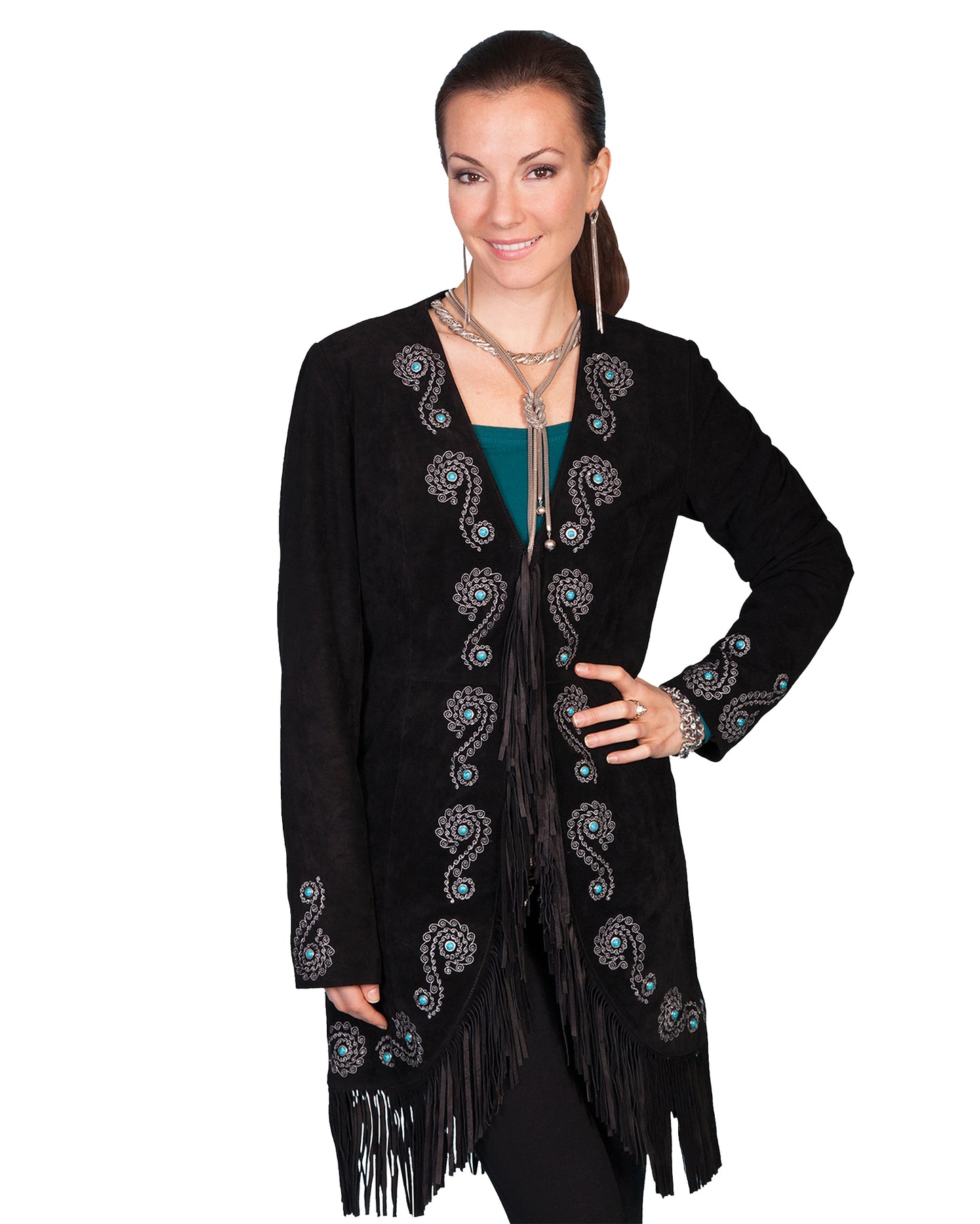 Fringe embroidered suede coat. This stylish classic coat features a silver thread design with turquoise studs. It has hidden side entry pockets. Hook and eye closure. Lined.