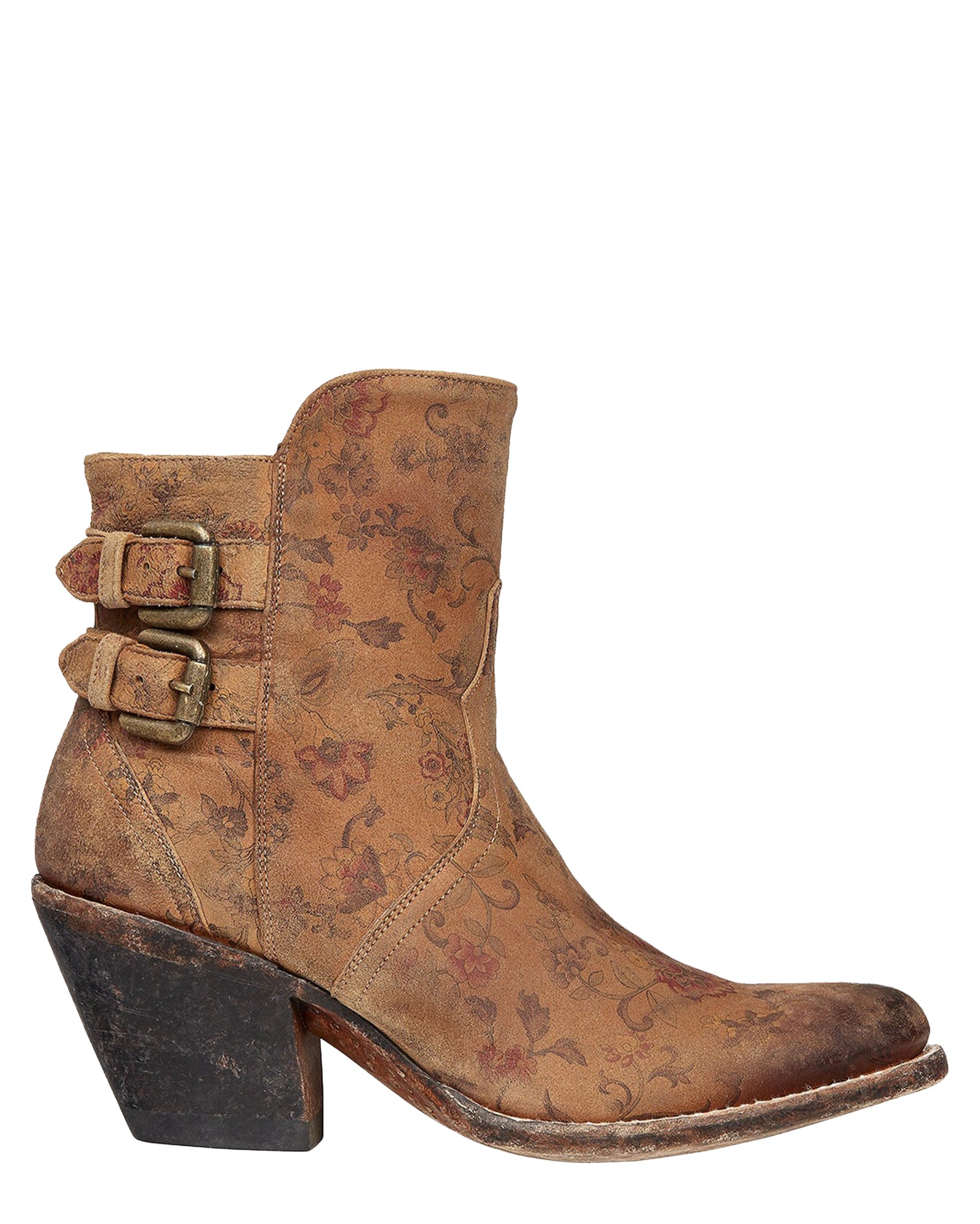 These Lucchese Catalina booties are perfect with a pair of bootcut jeans. They feature distressed printed leather throughout the vamp and shaft. The variation in color blends to a darker toe. The higher front shaft and vamp detail will look great peeking out from under your jeans. The double buckles and side zipper will ensure a perfect fit. These are ideal for when you want to look casual, but still put together. These boots are everything you’d expect from Lucchese with a unique, casual flair.