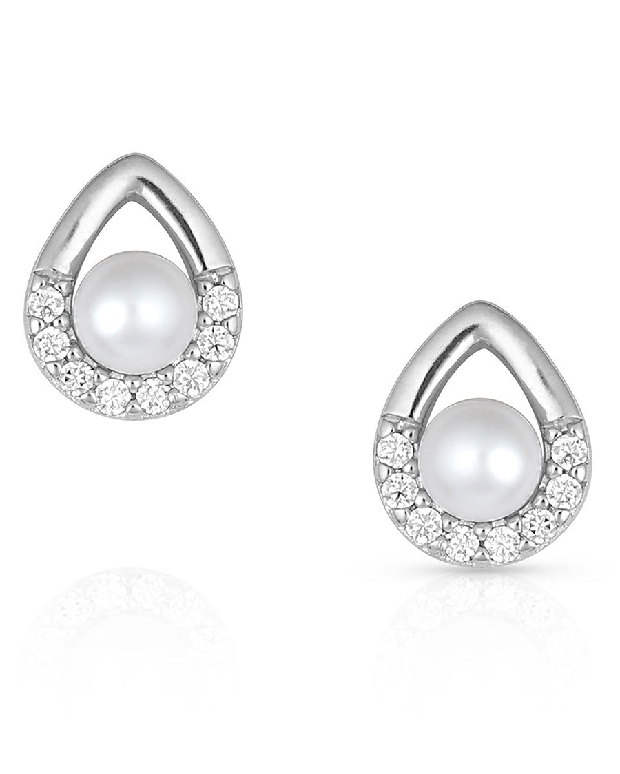 - Materials: Rhodium over a brass base. Paint. Stainless steel post backs. Cubic zirconia stones. Freshwater pearls.