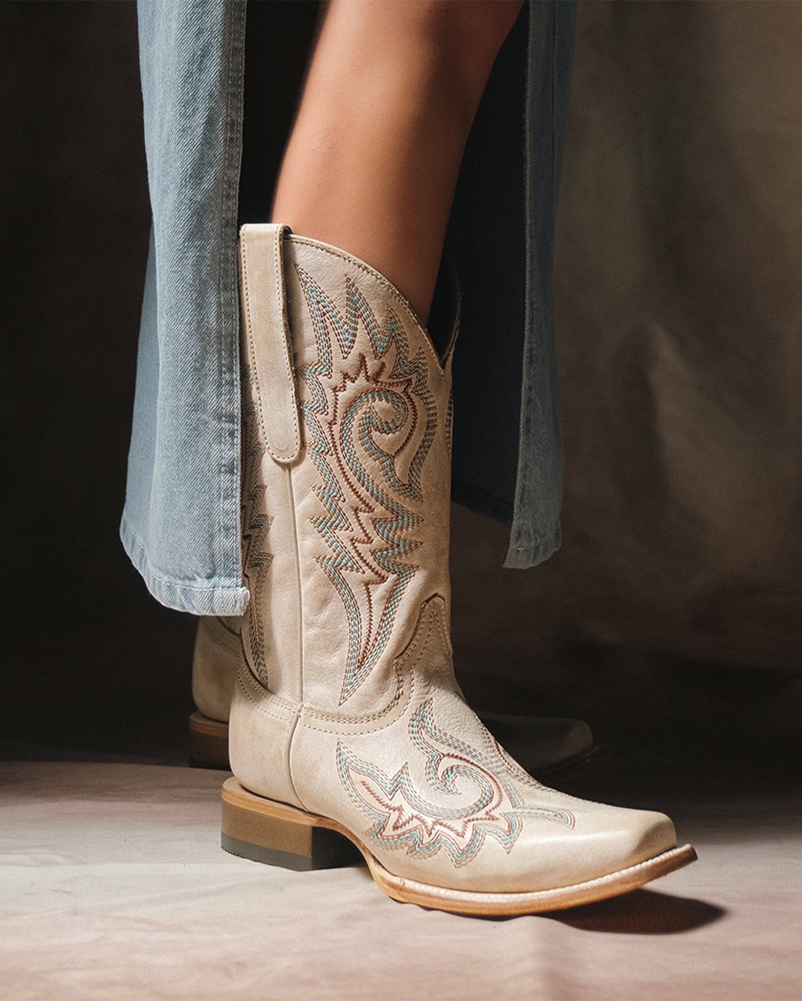 These Women's Flames Western Boots in a straw color showcase a bold square toe design complemented by intricate blue and red flame embroidery. The detailed decorative stitching adds a dynamic and stylish flair, perfect for those seeking a distinctive look rooted in classic Western craftsmanship. Durable and eye-catching, these boots are crafted to provide both comfort and lasting style for everyday wear or special occasions.
