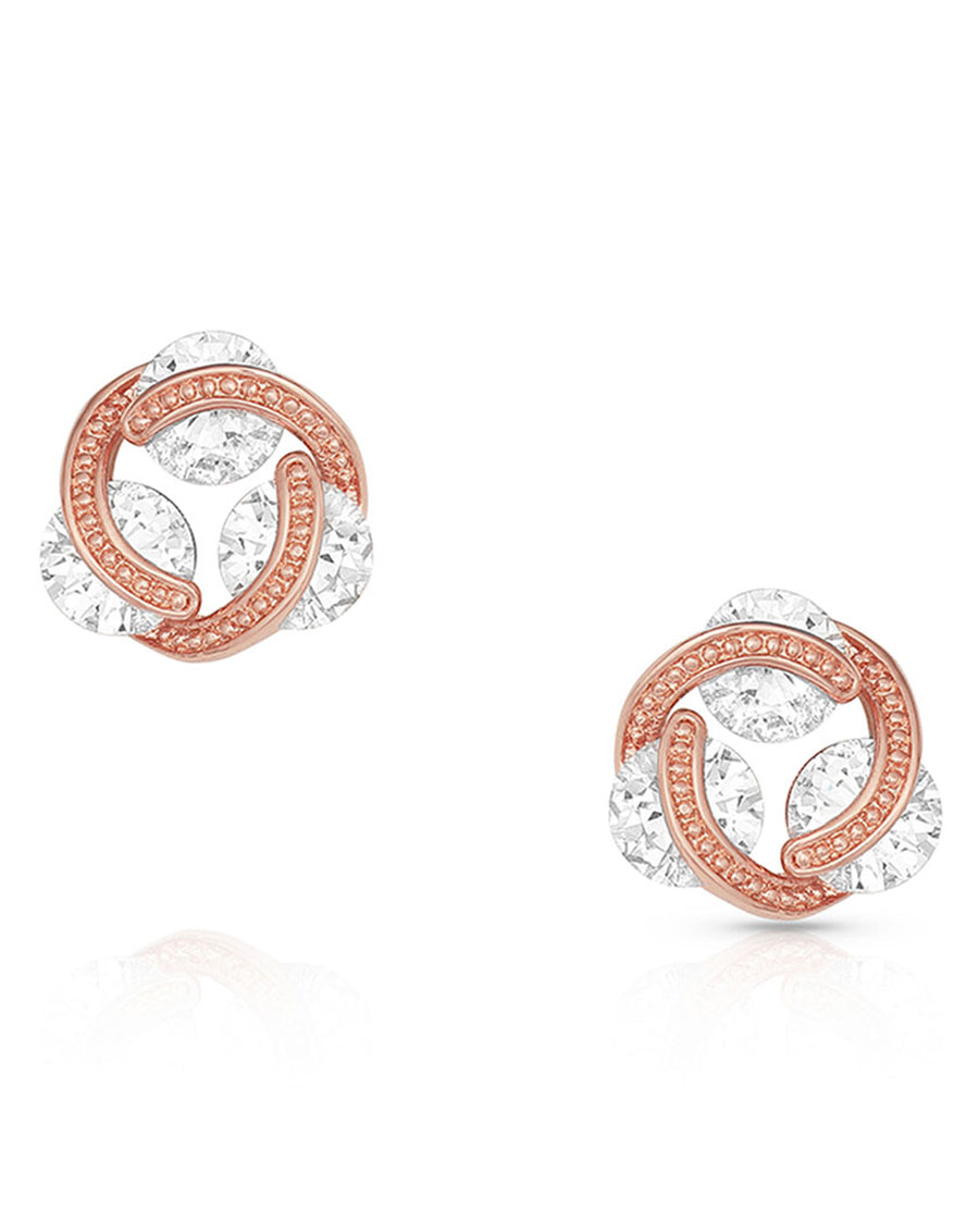 - Organically bumpy rose-gold crystal stud earrings that have an additional roped crystal twist throughout them.
