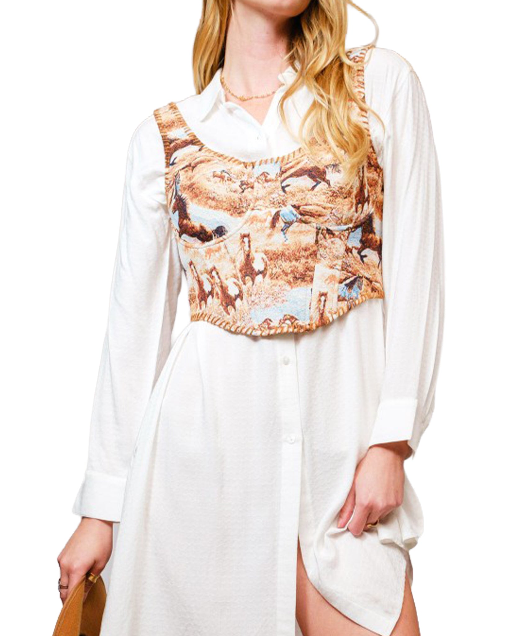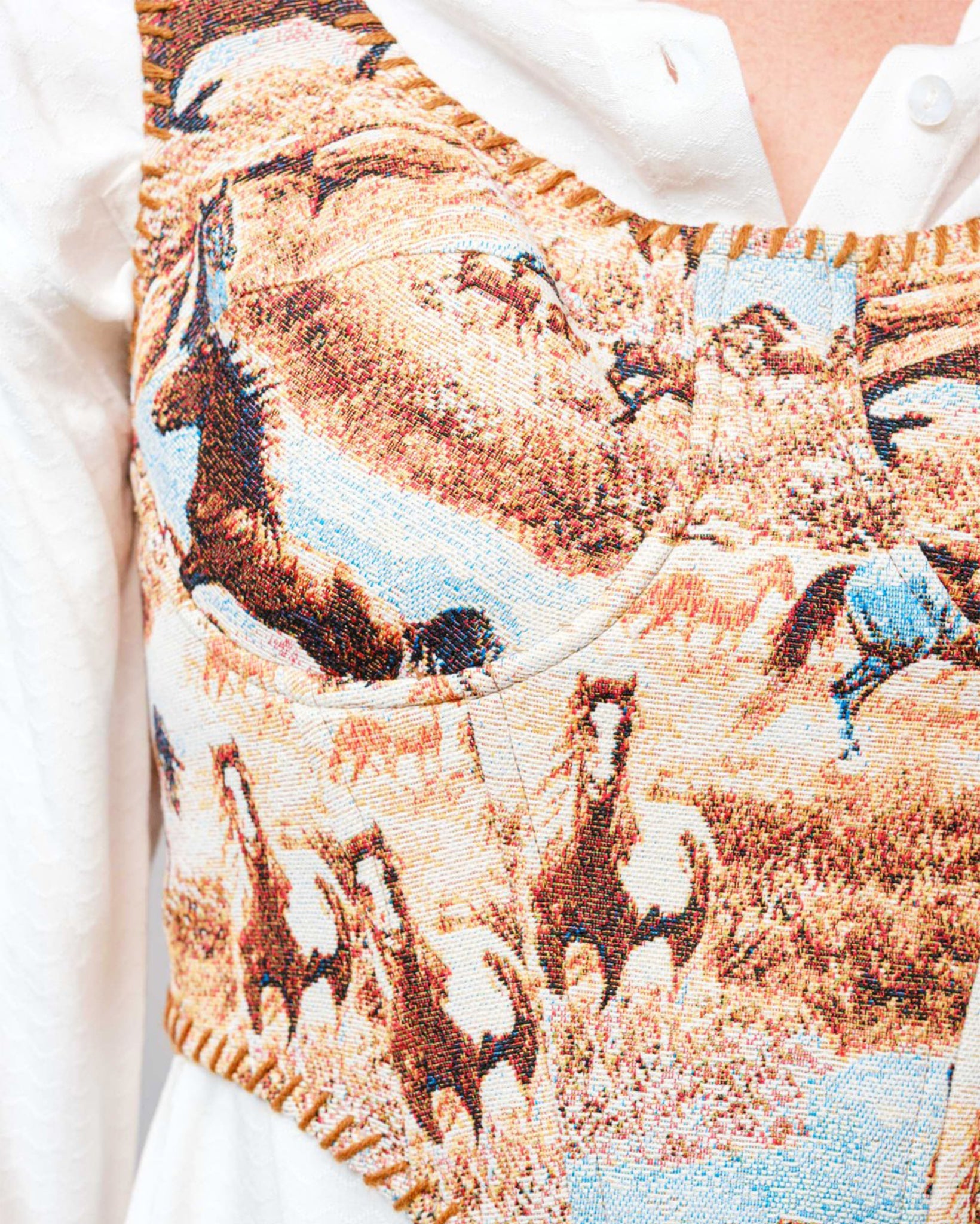 Western-inspired jacquard corset top featuring a horse print, structured fit, and stitched edges. Designed with a hook-back closure and cropped silhouette, perfect for layering over dresses or tops.