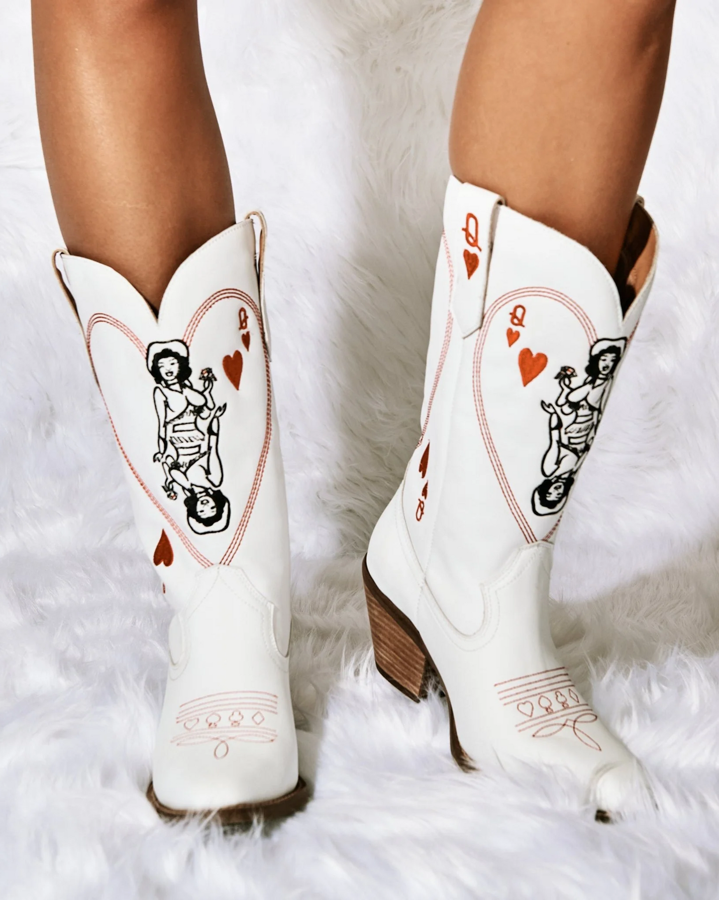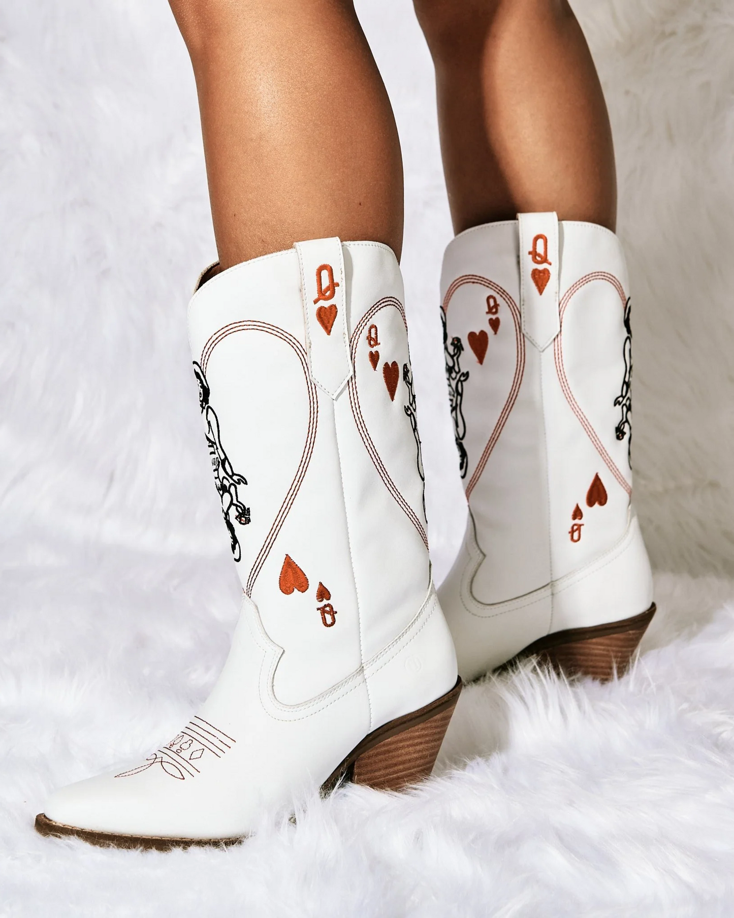Step into western royalty, where everything is coming up roses with our Queen A Hearts boot from Dingo1969. Featuring unique and stately stitching throughout the shaft and a 2-1/4 inch heel, the 12-inch Queen A Hearts ensures no matter the hand you play, you're sure to win.