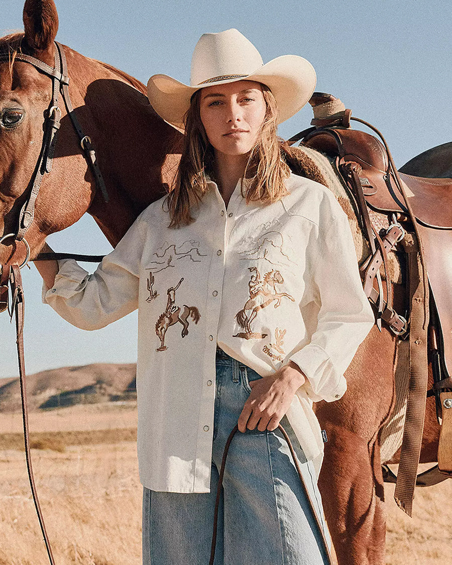 This Women’s Wrangler Retro® Embroidered Boyfriend Western Snap Denim Shirt pays tribute to the time-honored tradition of horse training and rodeo. It features embroidered artwork of a bronc rider in a round pen on one side and a cowboy riding a rearing horse on the other side, with mountains in the distance. This lightweight denim shirt is crafted from 100% cotton and finished with pearl snaps for an authentic cowgirl look. Best of all, its boyfriend fit offers that broken-in feeling right from the start.