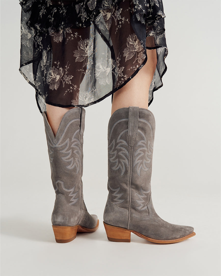 Meet The Annie, our best-selling cowgirl boot. Tall and timeless, a beautiful tonal stitching pattern adorns its 14” shaft, the top of which features a deep scallop for a comfortable, flattering fit. A fashion-forward snip toe leads the way and our signature toe stitching rounds out a classic look open to a wide range of styling possibilities. These premium boots are not to be missed and will age beautifully over time.
