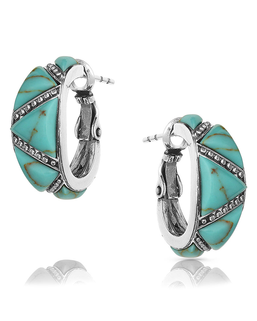 - These turquoise hoop earrings are finished in fine silver. They are a hoop shape with a print of turquoise stone. Between turquoise pieces lie crystal studs.