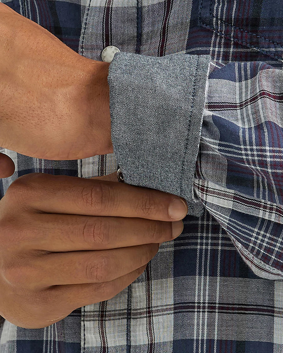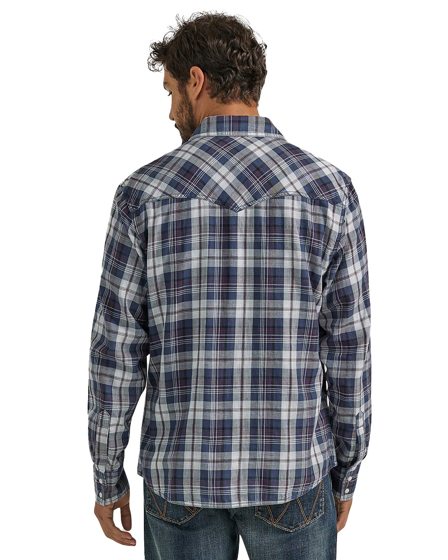Our men's Wrangler Retro® Premium long-sleeve western snap plaid shirt delivers all the authentic western styling you love but with a modern fit that's perfect for the contemporary cowboy. It's crafted from cotton for all-day comfort and long-lasting durability. Plus, it features pointed front and back yokes, contrast trim, snap cuffs, and a full snap closure. You can easily wear this long-sleeve snap shirt all year long, and it looks great layered over a white t-shirt. Complete the look with your favorite pair of Wrangler Retro bootcut or slim-fit jeans.