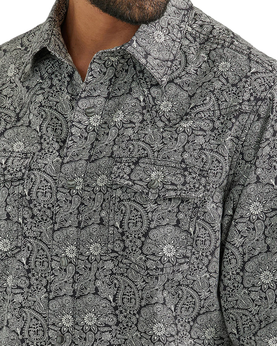Look good while feeling good in the men's Wrangler Retro® long-sleeve western snap printed shirt. This contemporary take on the classic style you love comes packed with all the distinctive details, including pointed front and back yokes, single-needle stitching at the placket, modern fit, contrast trim, two snap cuffs, and two chest flap pockets with snaps. This long-sleeve snap shirt features a modern fit and it's crafted from cotton for comfort, minimal wrinkling, and long-lasting looks. Complete the outfit with Wrangler Retro jeans.