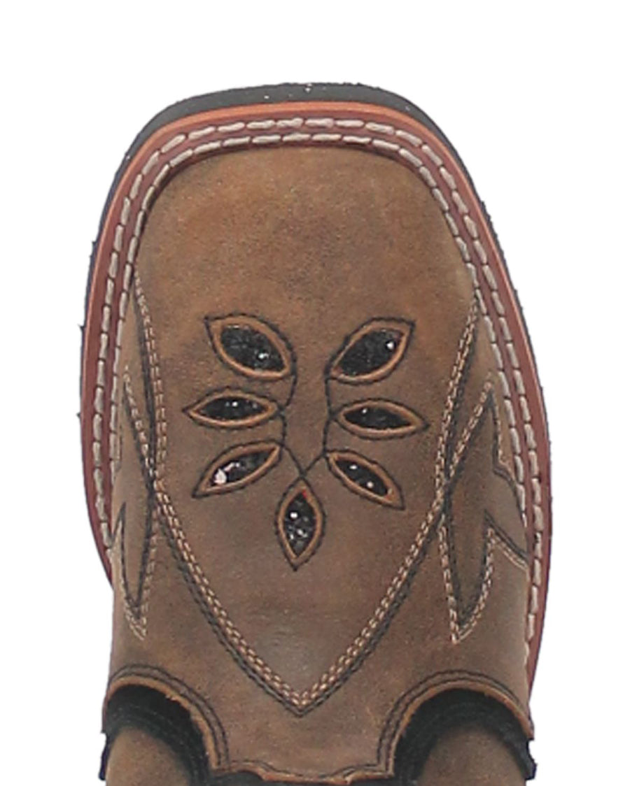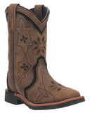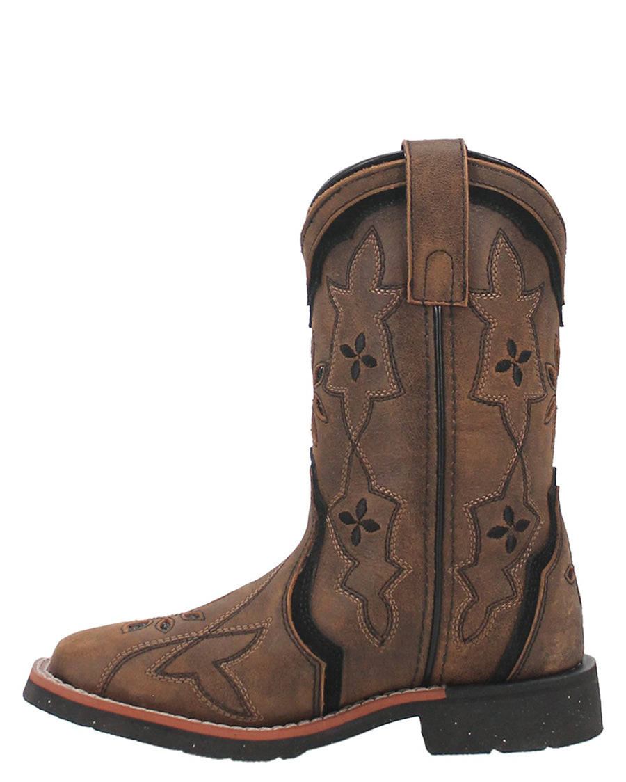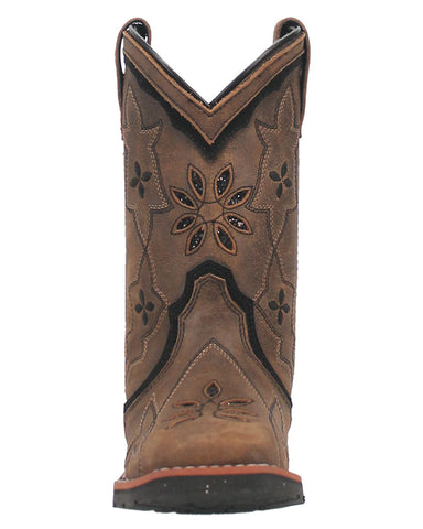 Inspired flower design highlights the Dan Post Posy design. Made of genuine honey leather with fancy stitch design and accented with floral underlays. Long-wearing rubber outsole, broad square toe and stockman heel. A pretty boot for a pretty girl!